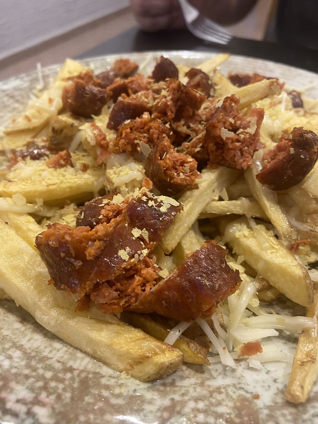 Patatas fritas con chorizo de Heura (bonus points por ponerle levadura…