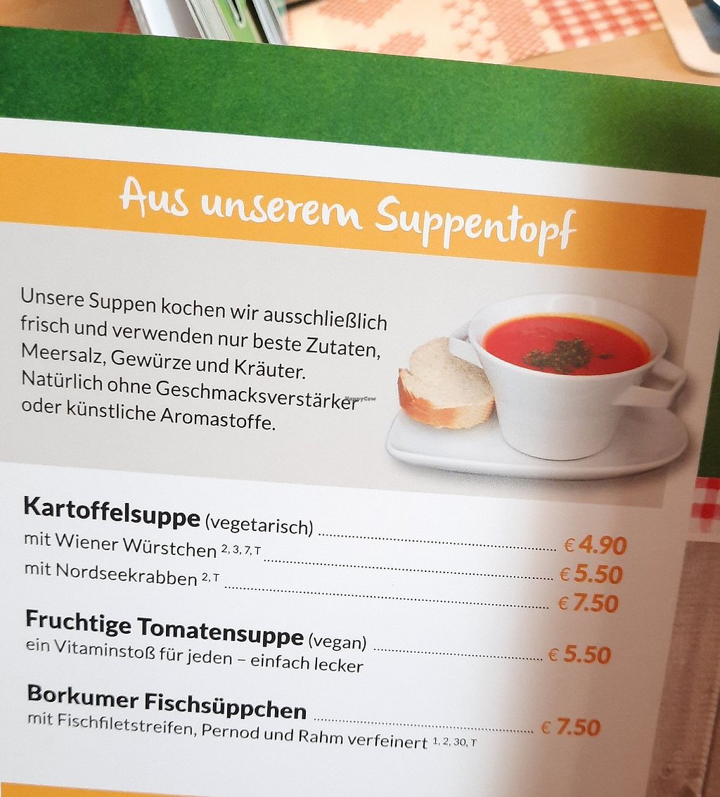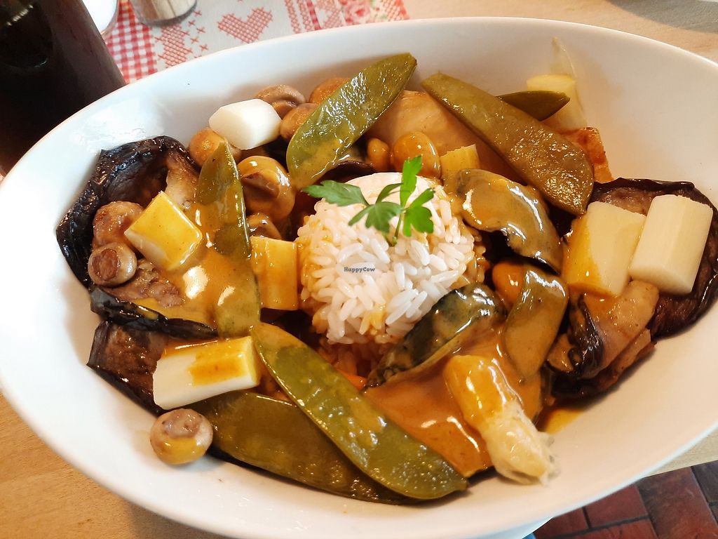 Es gibt 3 vegan gekennzeichnet Gerichte. Das Gemüse aus dem Wok war sehr lecker und mit reichlich Gemüse. Die Tomatensuppe war okay. Vor dem Lokal ist ein Spielplatz, die Spielgeräte sind aber zum Teil reperaturbedürftig.