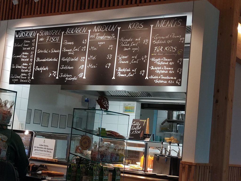 Serves meat, vegan options available. Restaurant in Baumwipfeldfad with vegan choices. Menu includes vegan schnitzel, soup and snacks from Koro and Veganz. Free access to the general public.