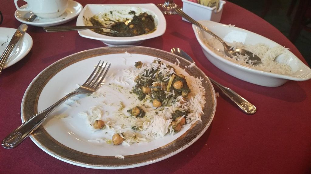 Started with a little chicken pea with cummin with dipping deal. No liqueur license so that was a good thing for the diet and calorie count. A little Chai tea cappuccino. Got a assorted vegetarian platter (vegetable samosa, vegetable Pakoras ** liked, and Aloo Tikki ) Entree was a Chaana Saab (chicken peas cooked with onions, garlic, and spices. )