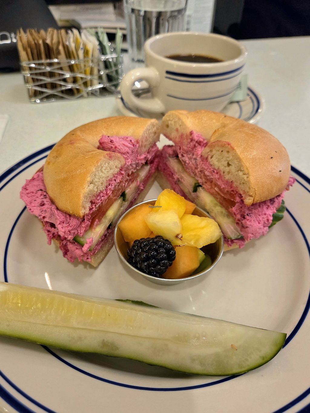 Everything bagel with scallion cream cheese, tomato, cucumber