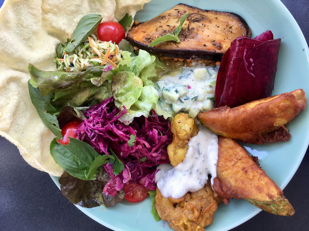Veggie burgers were very flavorful, with lentils, seeds and spices. Lentil dal and jasmine rice was also a popular dish with our group. The tarts for dessert ( lemon and apricot) were also delicious. The only item we found a bit bland was the peach ice tea. Perhaps it was just not sweet enough for our palette. But I highly recommend this restaurant. Service was friendly, attentive and the food came out quickly despite there being quite a few guests during out lunchtime visit.