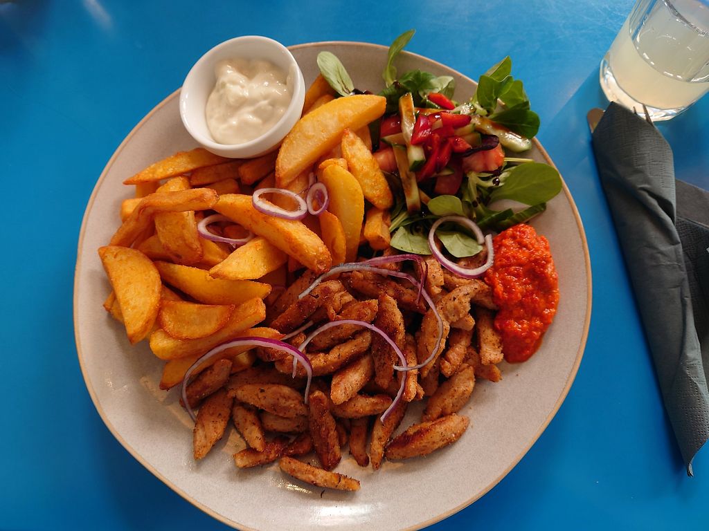 Beyond meat burger and homemade fries 🤤 ⬆️ Gyros plate ⬇️