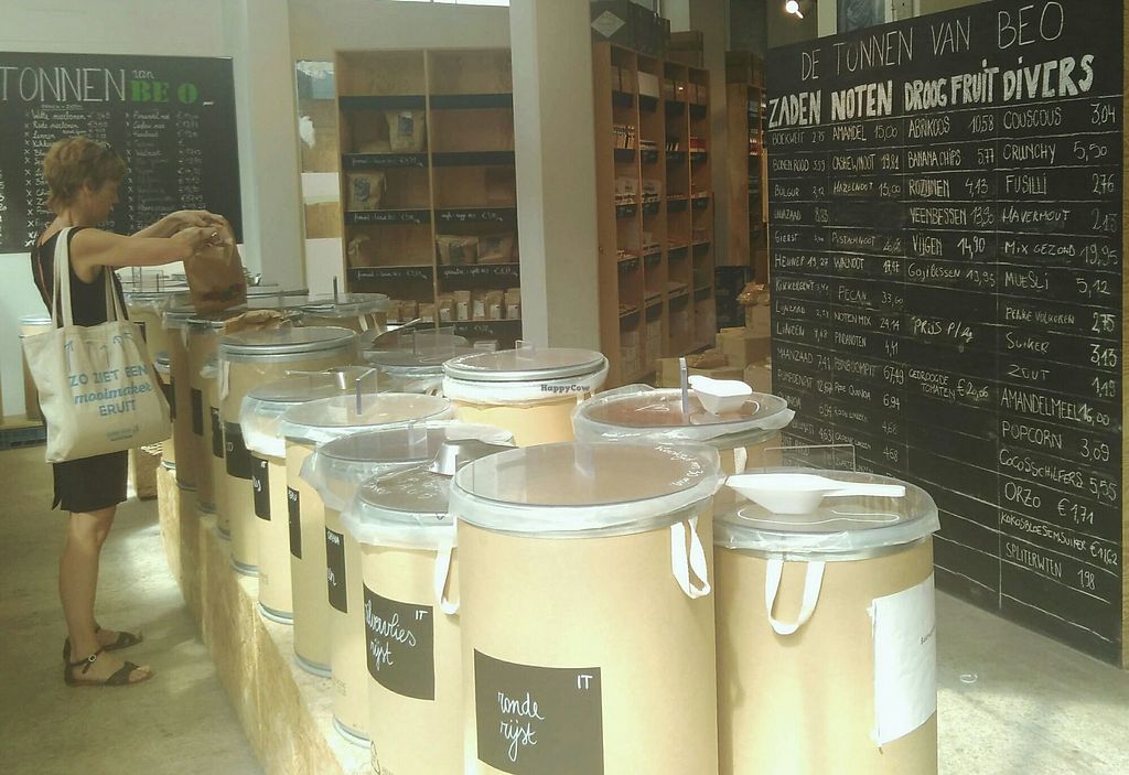 BE O is an all organic fruit and vegetables market with an eleborate cheese counter and tuns with dried goods (nuts, grains, pasta, rice,...). They also sell wine (also in bulk!), fruit juices, coffee (grained or not), olive oil (bulk!), organic meat and tea. They are bulk-friendly: even if there is no obvious infrastructure to weigh home-brought containers at the entrance, you can ask to weigh them and they'll write the tarra weight on your container. You can also reuse (paper) bags. Anything that is sold in bulk (90% of the goods I think) is thus available waste free.