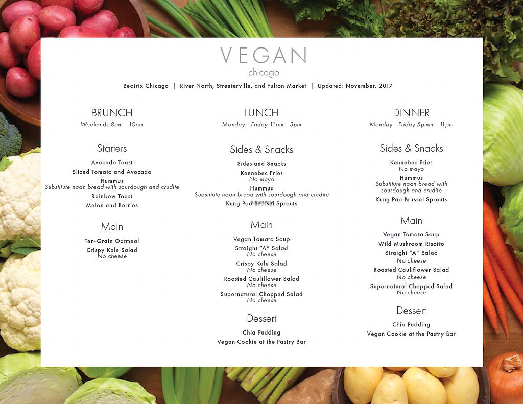 Vegetarians and vegans, did you know that Beatrix is stocked with vegan options? After speaking with River North's extremely helpful GM, Steven, he helped identify vegan options for brunch, lunch, dinner, AND dessert. Take a look at their vegan options as of November 2017 in the picture attached and on my site here: https://www.veganchicago.co/restaurants/#/beatrix/.