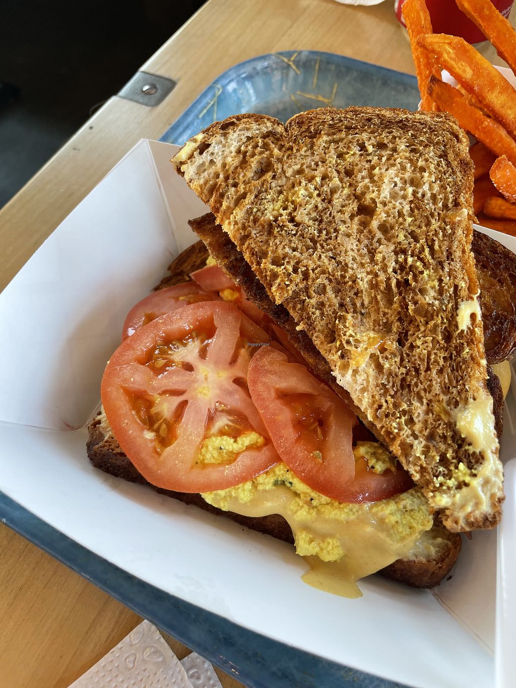 Bedeviled sandwich with fries and sweet potato fries