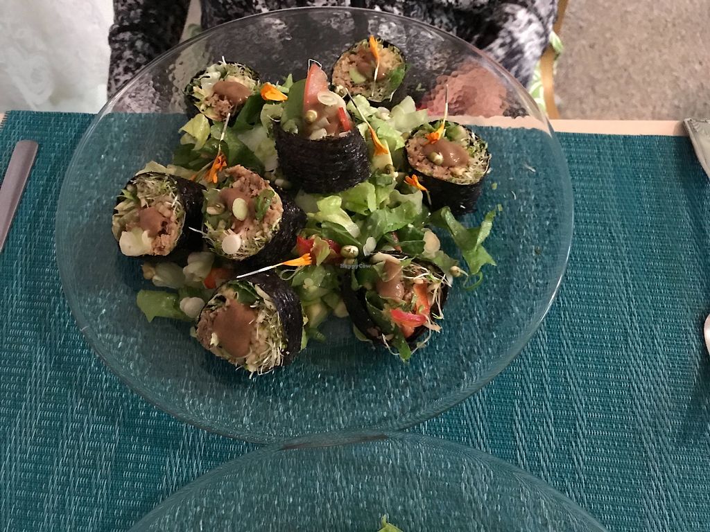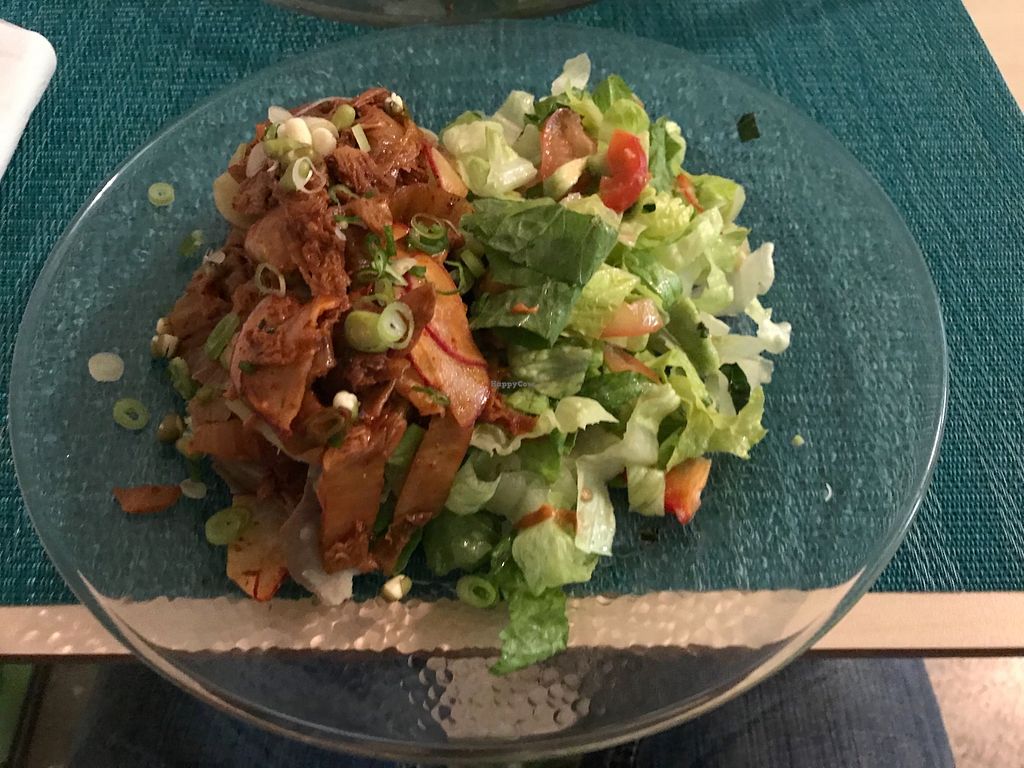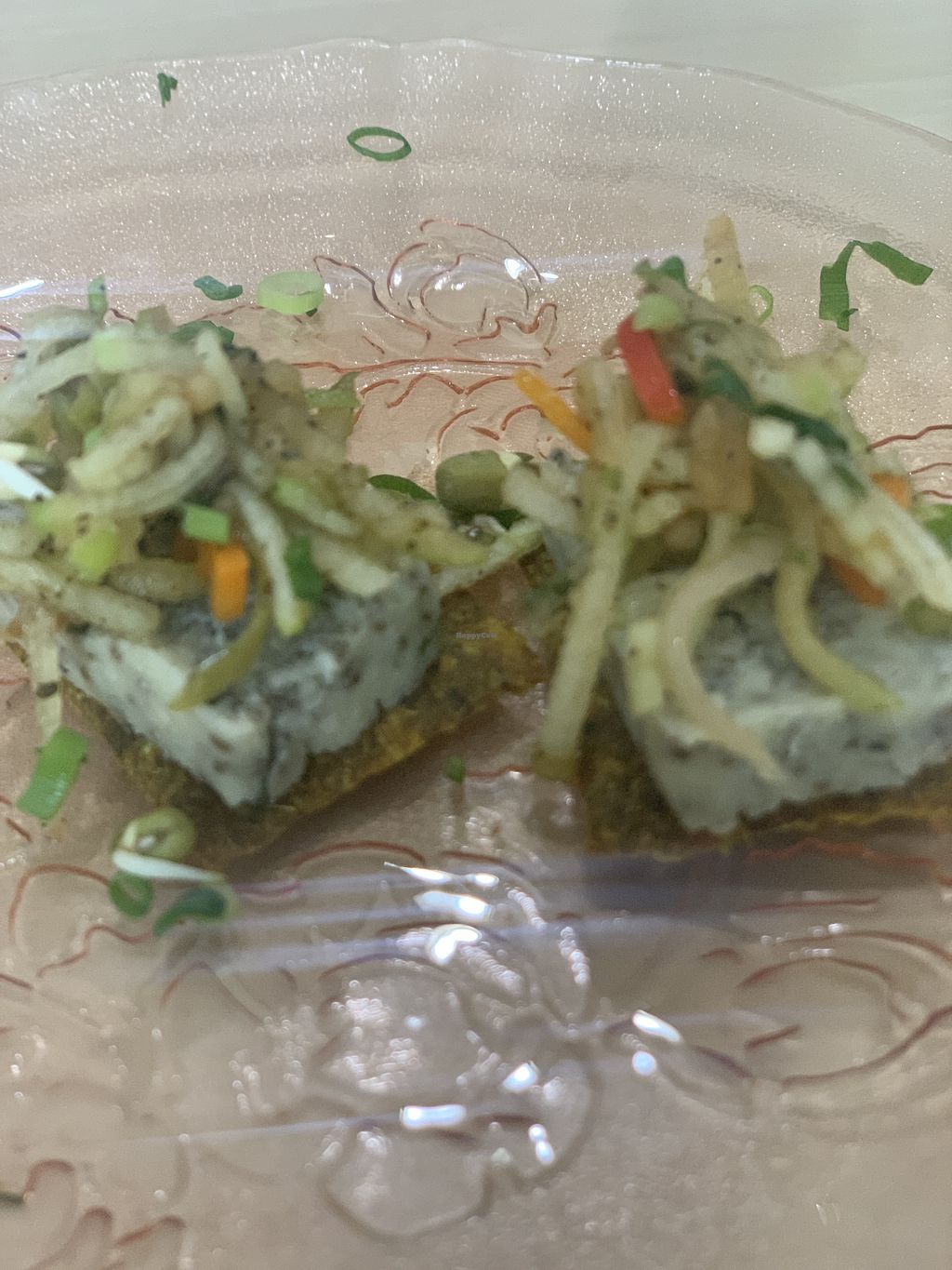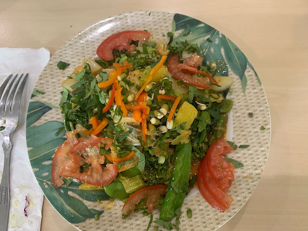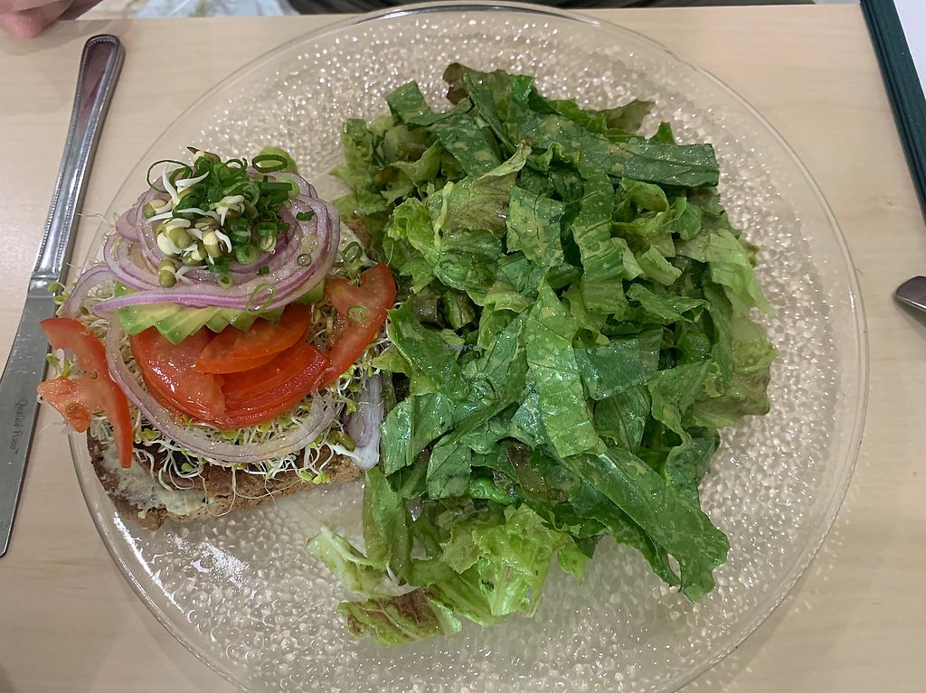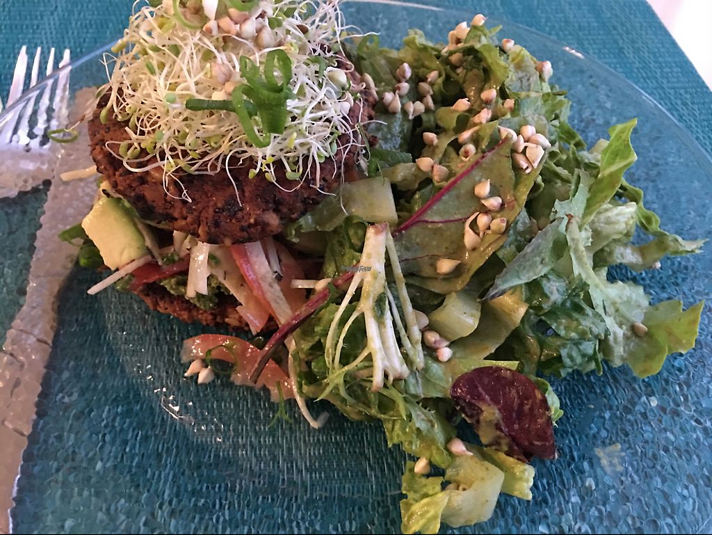 Tasty salad with piece of onion flat bread at Beauty of Sprouts.