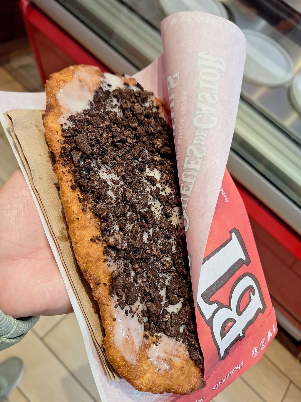 Schmeckt sehr süß und sehr lecker. Ich hatte die Variante mit Vanilla Icing & Oreo. Klare Empfehlung zum probieren. Da es sehr süß ist reicht mir ein halber also am besten am Anfang teilen ☺️ Der Teig erinnert an deutschen Schmalzkuchen, den es auf Weihnachtsmärkten gibt😄