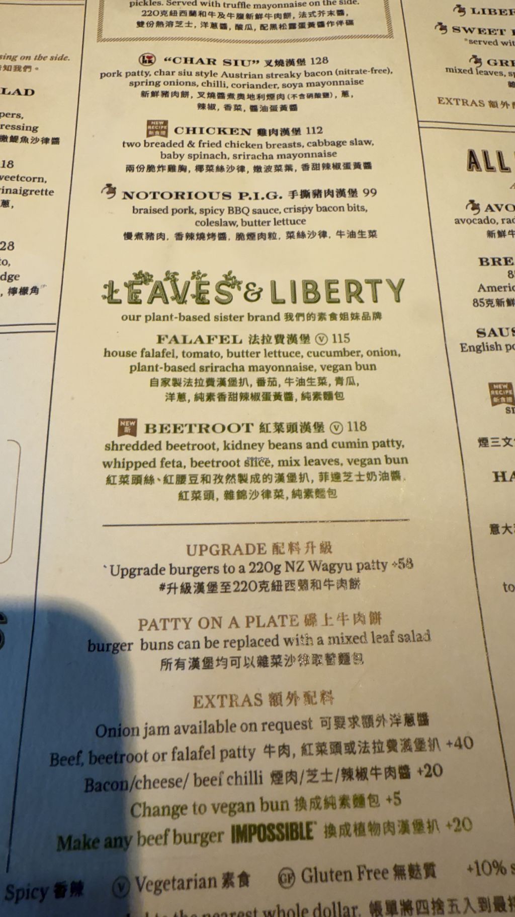 Serves meat, vegan options available. Despite the name, the menu denotes a few vegan options like the Impossible Burger with vegan mayonnaise, falafel burger, salads, and sorbet for dessert. Ask for vegan burger buns. On the International Departures upper food deck facing Louis Vitton. NOTE: As of 15 Dec, all beef burgers can be changed to Impossible patty for an additional HKD 20 and the buns can be changed to beetroot vegan bun for an additional HKD 5. NOTE: Reported April 2024 to have limited vegan options – please send updates to HappyCow.