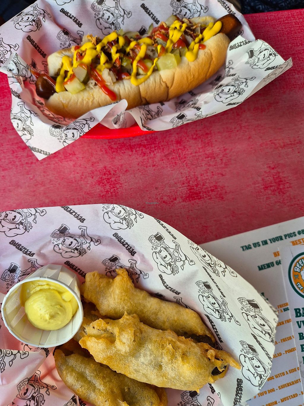 Had the norm hot dog with onion rings (5 onion rings for 3£ extra, ouch) and the battered gherkins.