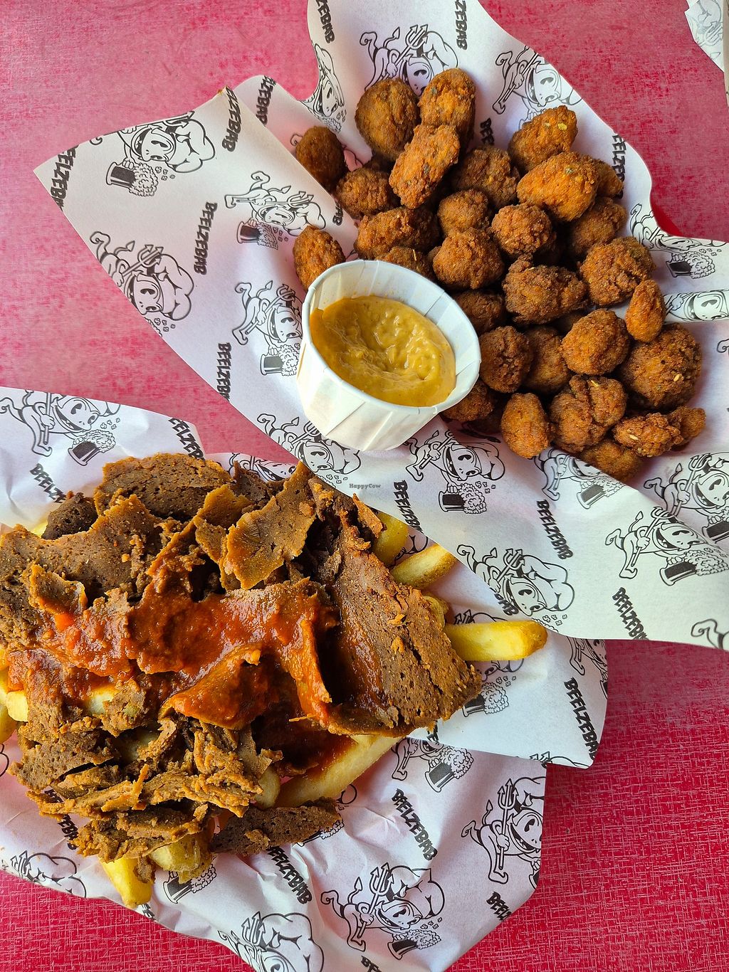 I had the loaded fries "meat n chips" which was chips covered in seitan doner and chilli sauce. Delicious and good value for money too. Good atmosphere in the bar they are based in (especially if you like rock music)
