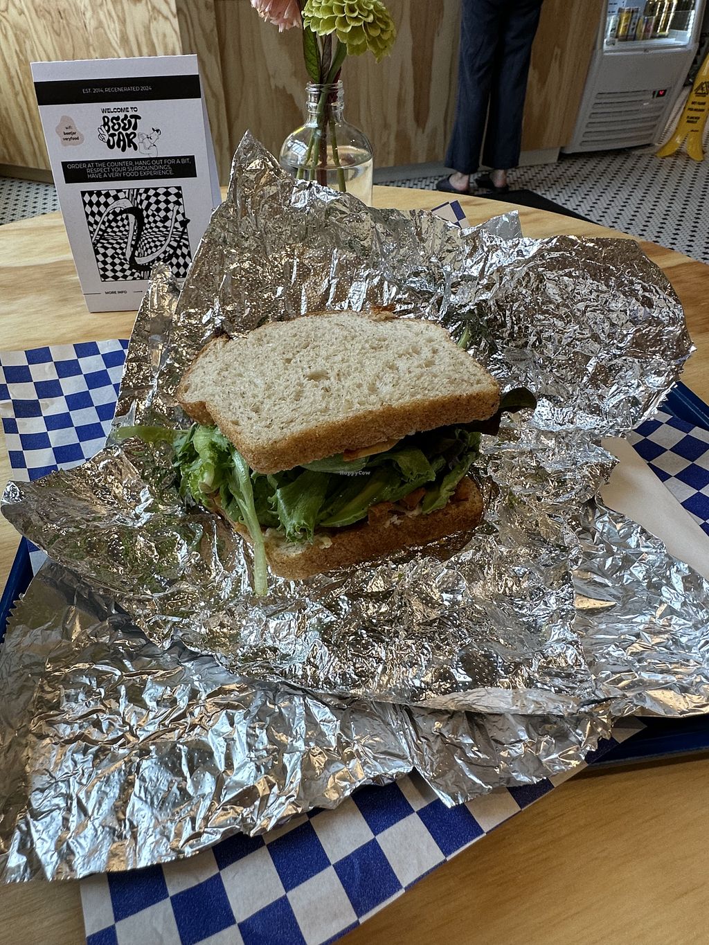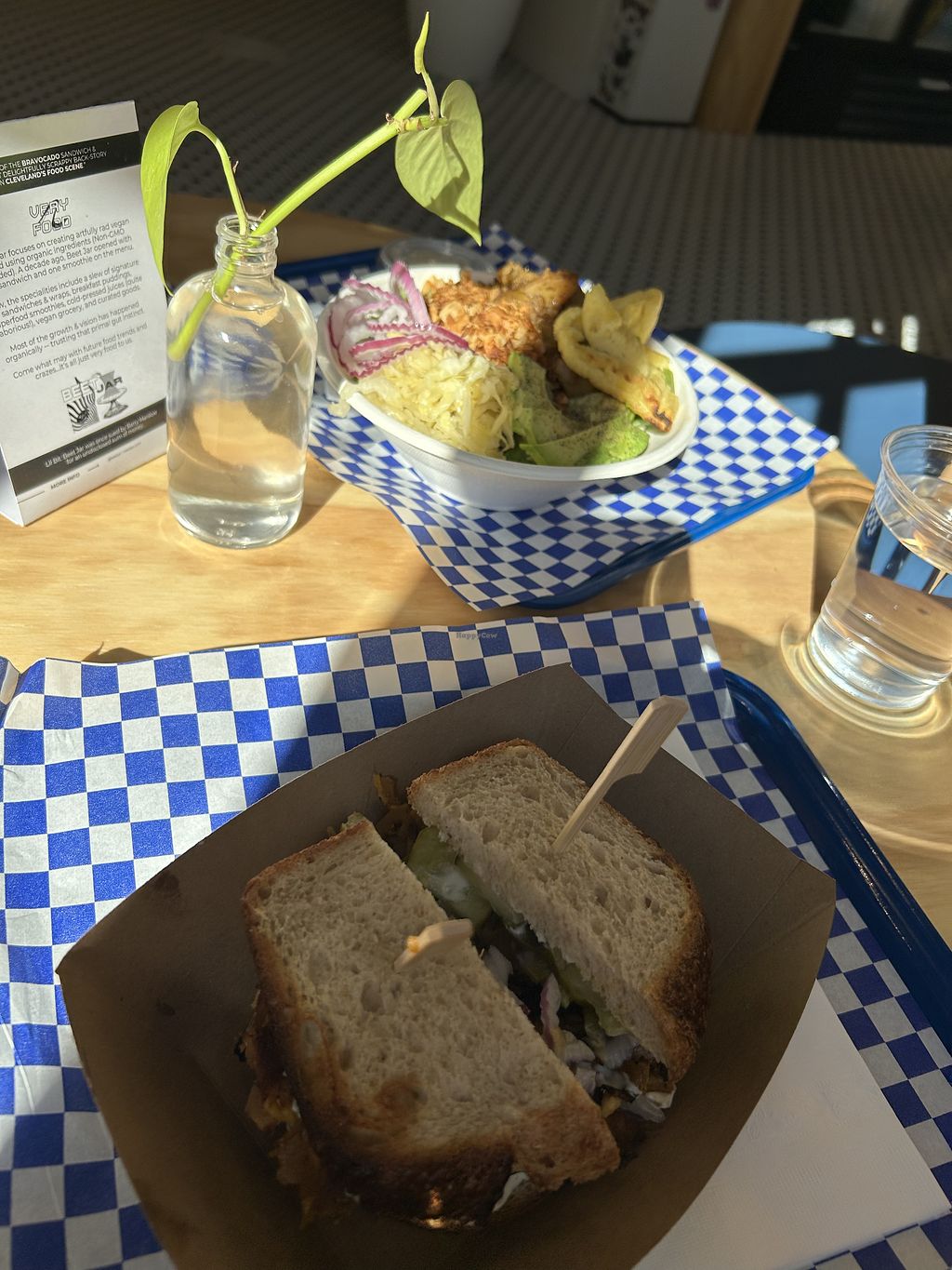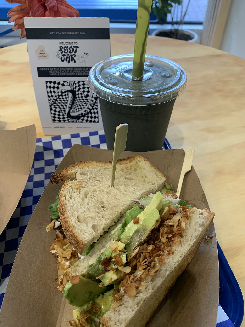 Bravocado sandwich and a black metal smoothie