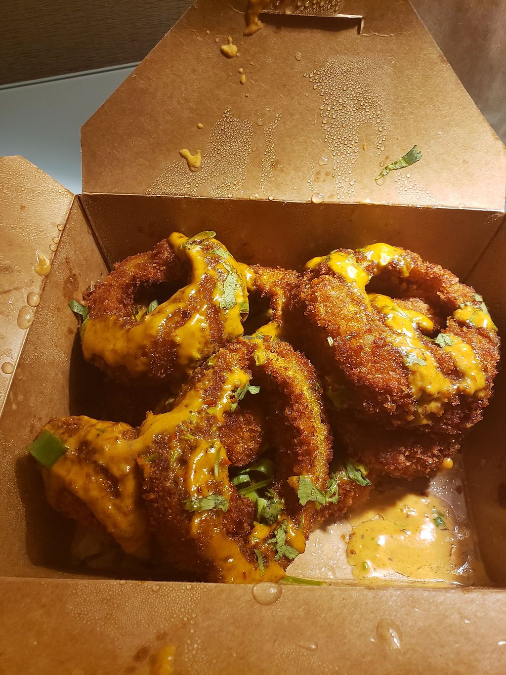 We got take out and really enjoyed it. We had the burger with cheese, fried chick-un sandwich and Nashville fried chicken-un sandwich. Preferred the Nashville over the plain as there was more flavour. Onion rings were great and the fries were too. Would be better fresh in restaurant but that’s not our current reality. Will come again.