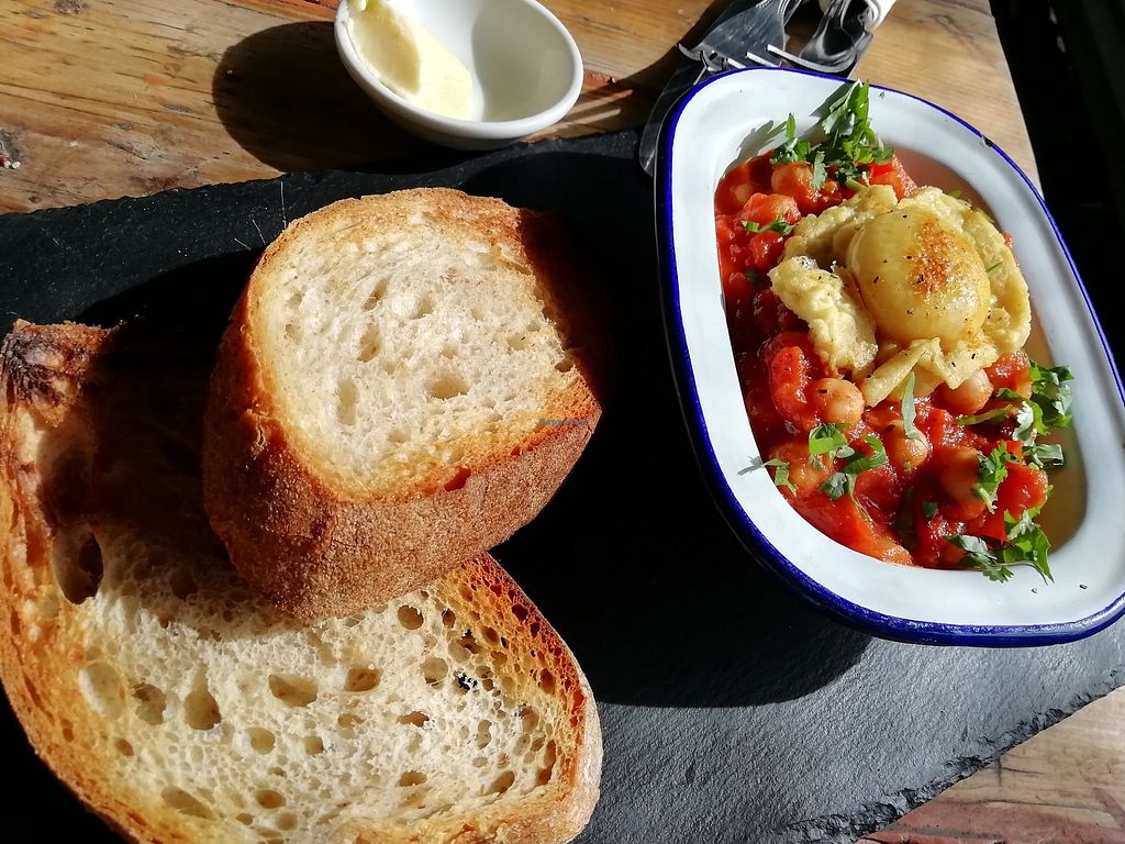 Shaksuka (chickpeas in tomato topped with fried 'egg')