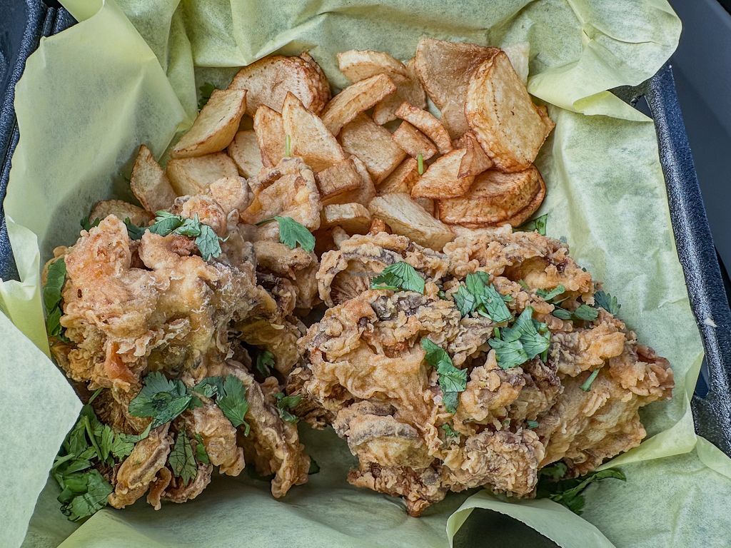 Fried “chicken” was just two large deep fried mushrooms. Very hard and…