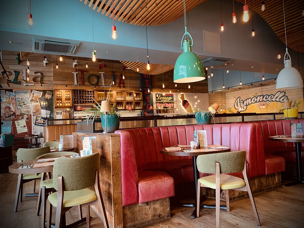 Serves meat, vegan options available. UK Italian restaurant chain using non-gmo ingredients. Vegan items are labeled V on the menu, and includes choices like bruschetta, red pepper hummus, Oumph! bolognese, pasta pomodoro, a margherita pizza, and salad. Has cookie dough and ice cream for dessert. Open Mon-Thu 12:00-21:00, Fri-Sat 11:00-22:30, Sun 12:00-21:00.