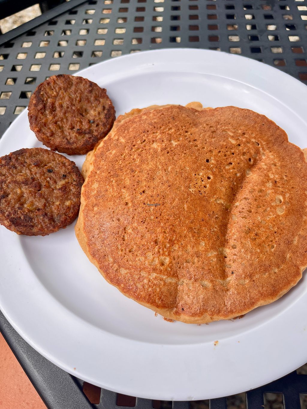 We had the veggie tempeh scramble (my husband had his made in a whole wheat wrap 👌🏼) We also had one vegan “man-cake”- a pancake with vegan sausage in it. All the food was delicious. I loved the veggie scramble.