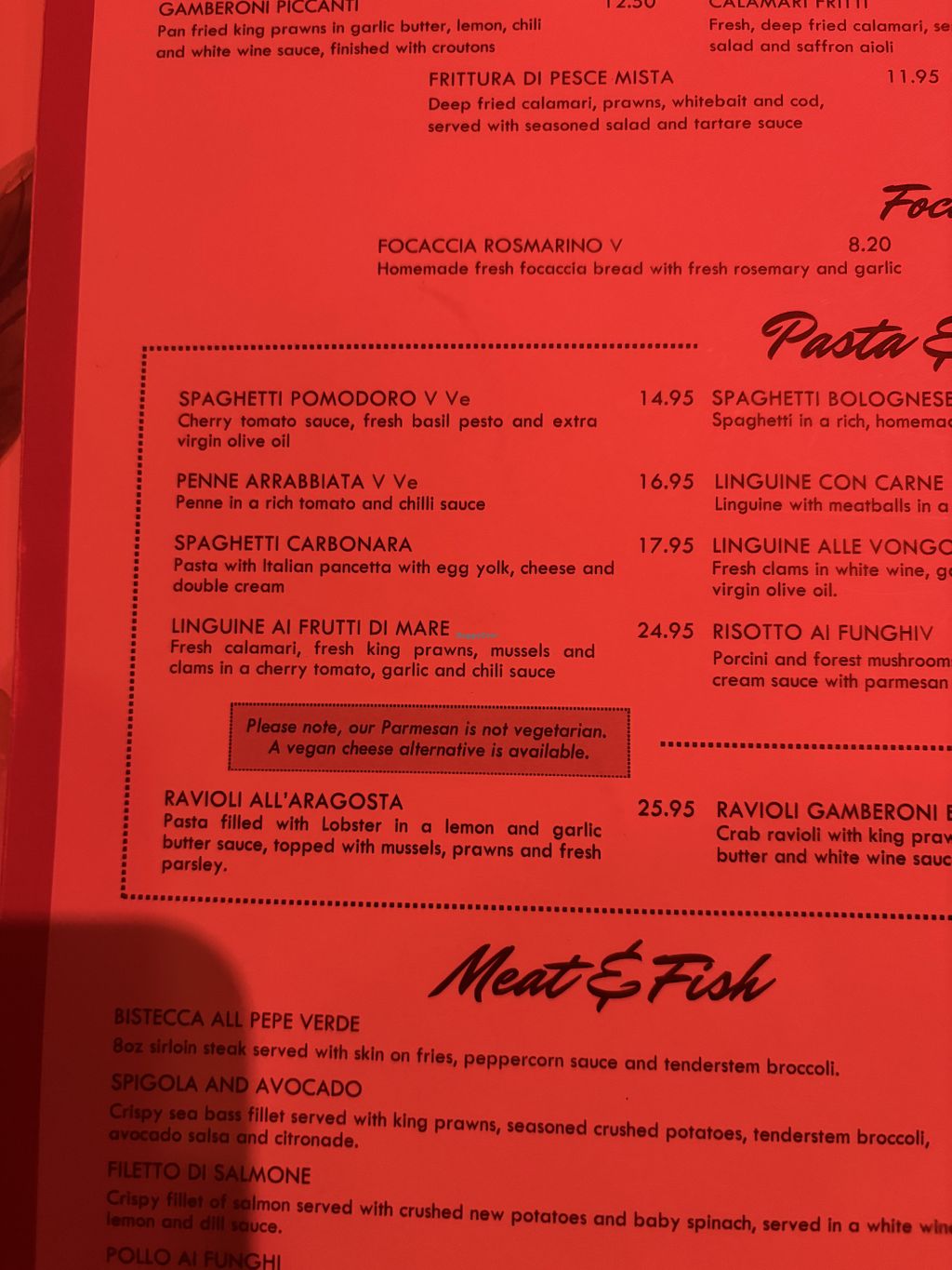 Serves meat, vegan options available. Italian restaurant with clearly labeled menu. Example vegan offerings include marinated olives, spaghetti pomodoro, penne arrabbiata and pizza with vegan cheese alternative. Open Mon-Sun 12:00-22:00.
