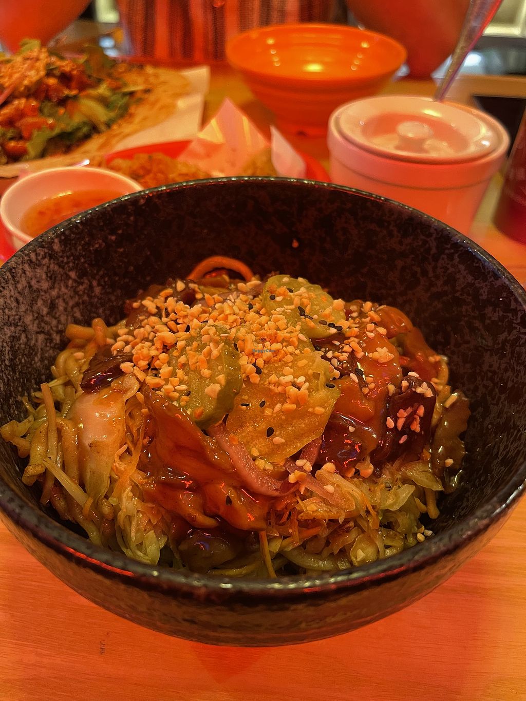 The menu is about half vegan. It’s mock meat heavy, so I didn’t expect to like much, but I was pleasantly surprised. We tried the ‘prawn’ dumplings, which I wasn’t keen on (never had real prawn so I found the texture strange), but I did like the lychee ‘pork’ and really liked the tofu salad. My companion also had the ‘chicken’ bao, which was the biggest bao I’ve ever seen. All the portions were huge. Definitely keen to go again and try some other things from the menu.