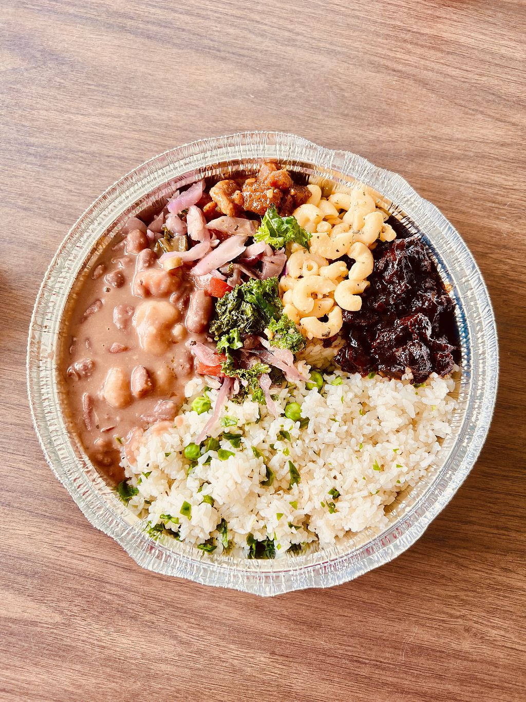 We loved the combination of flavors—I got the curry potatoes and BBQ with collard greens, chickpeas, and vegetable stew. My partner got the pepper beef and curry, greens, steamed vegetables, and noodles. So much delicious food! Enough for two meals ( we got the large size)
