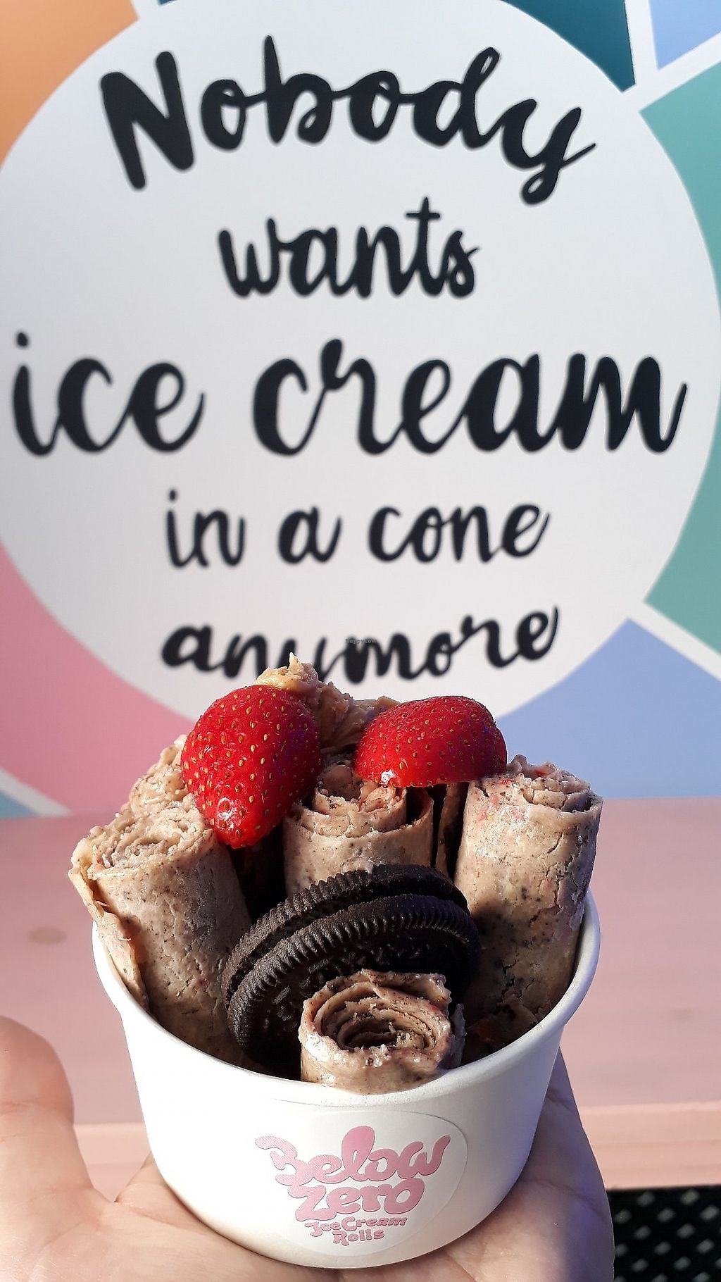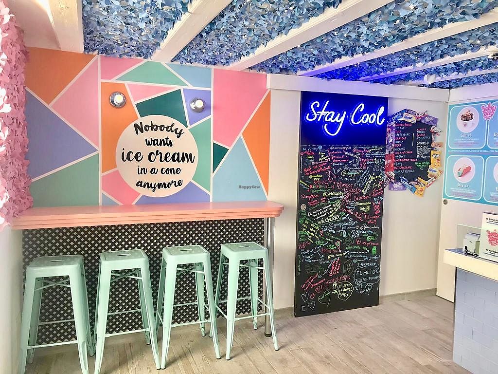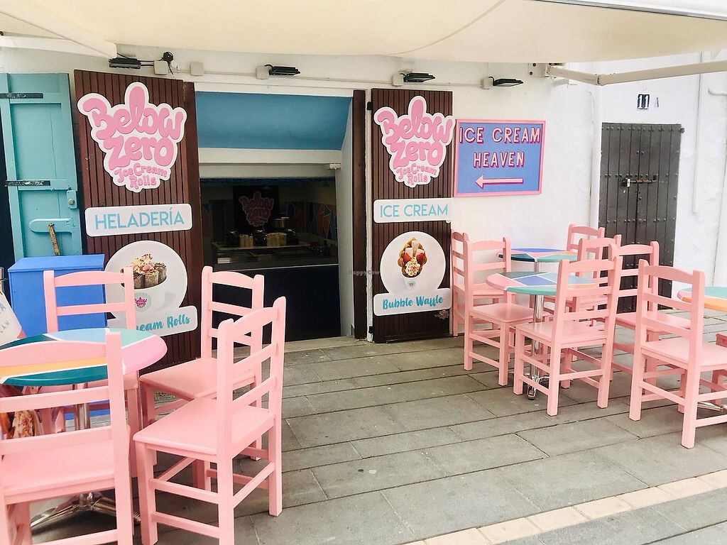 Ice cream roll bar in Ibiza old town by the port. Makes ice cream rolls to-order in front of the customer. Offers a vegan burrito which is dairy-free ice cream wrapped in a candy floss tortilla. Vegan flavors include banana, strawberry and peanut butter. Add-on options include Oreos. Reported closed September 2021.