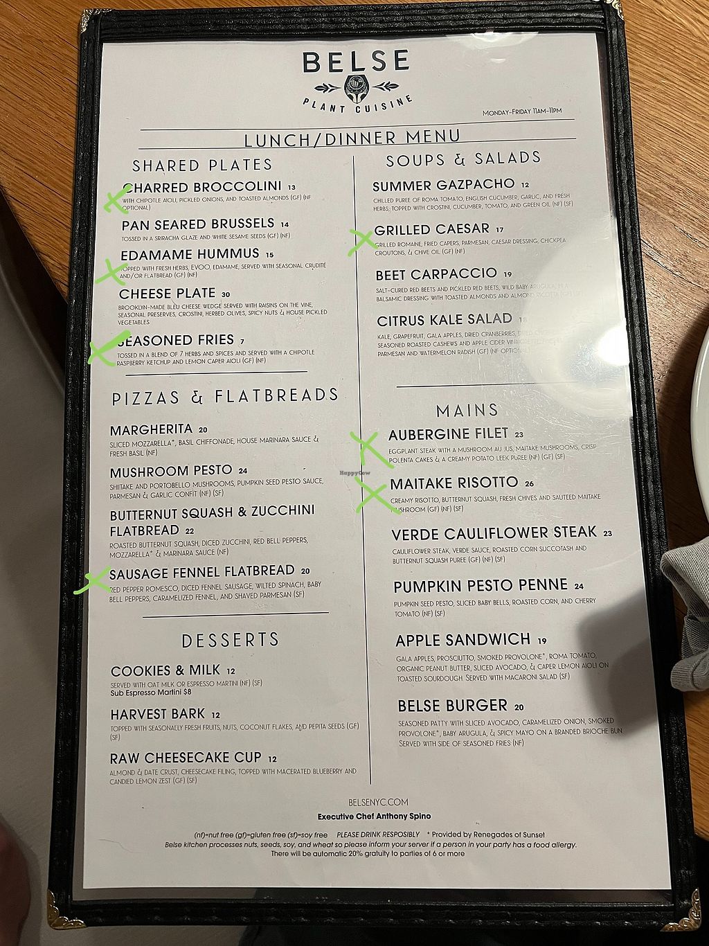 Belse menu at opening in June 2022. Crosses next to what we ordered.
