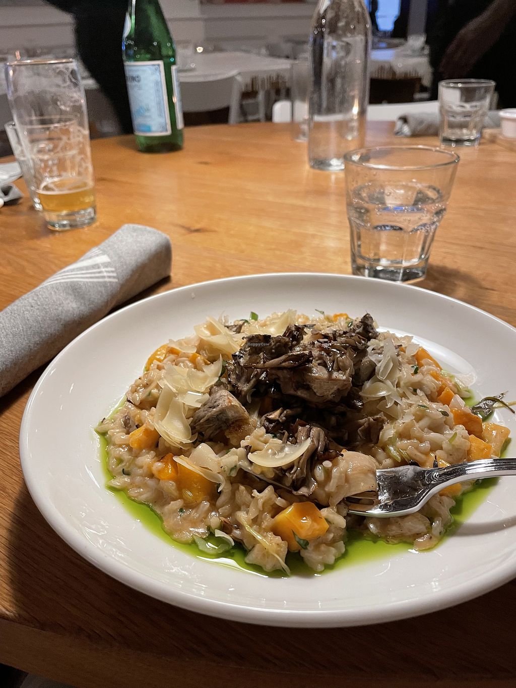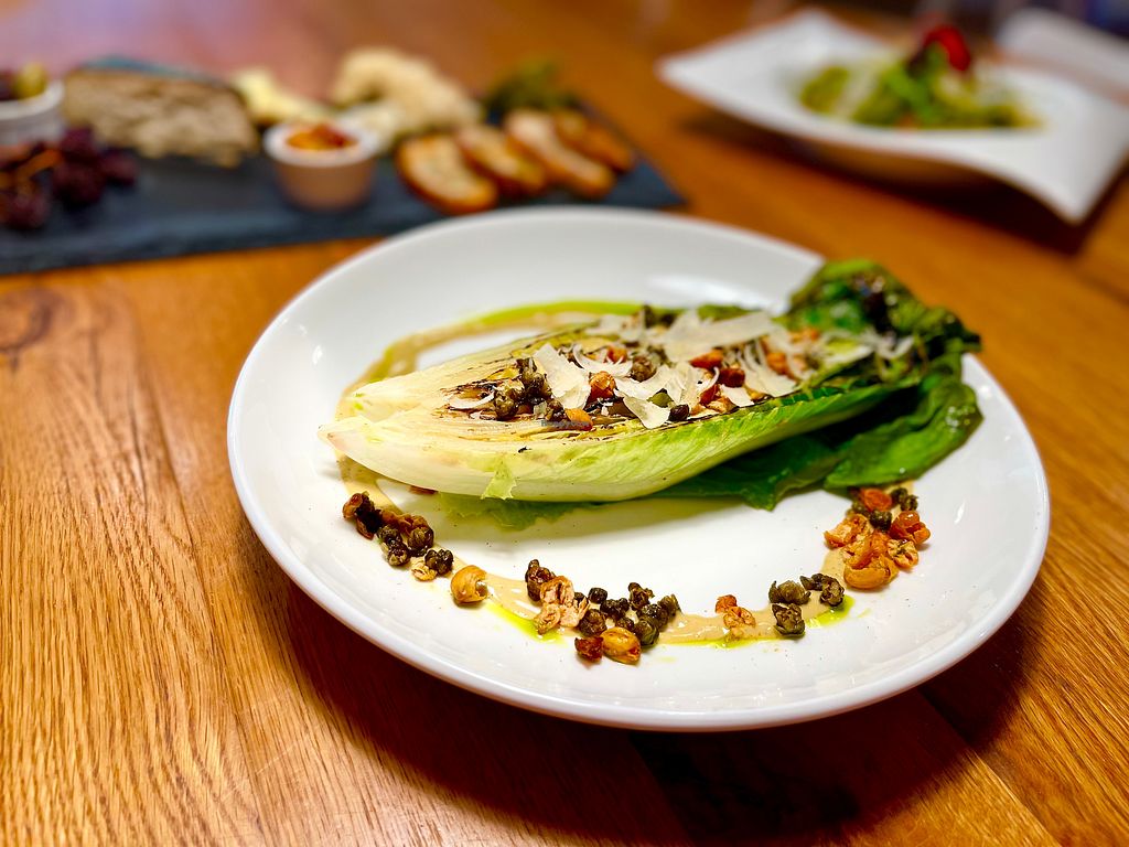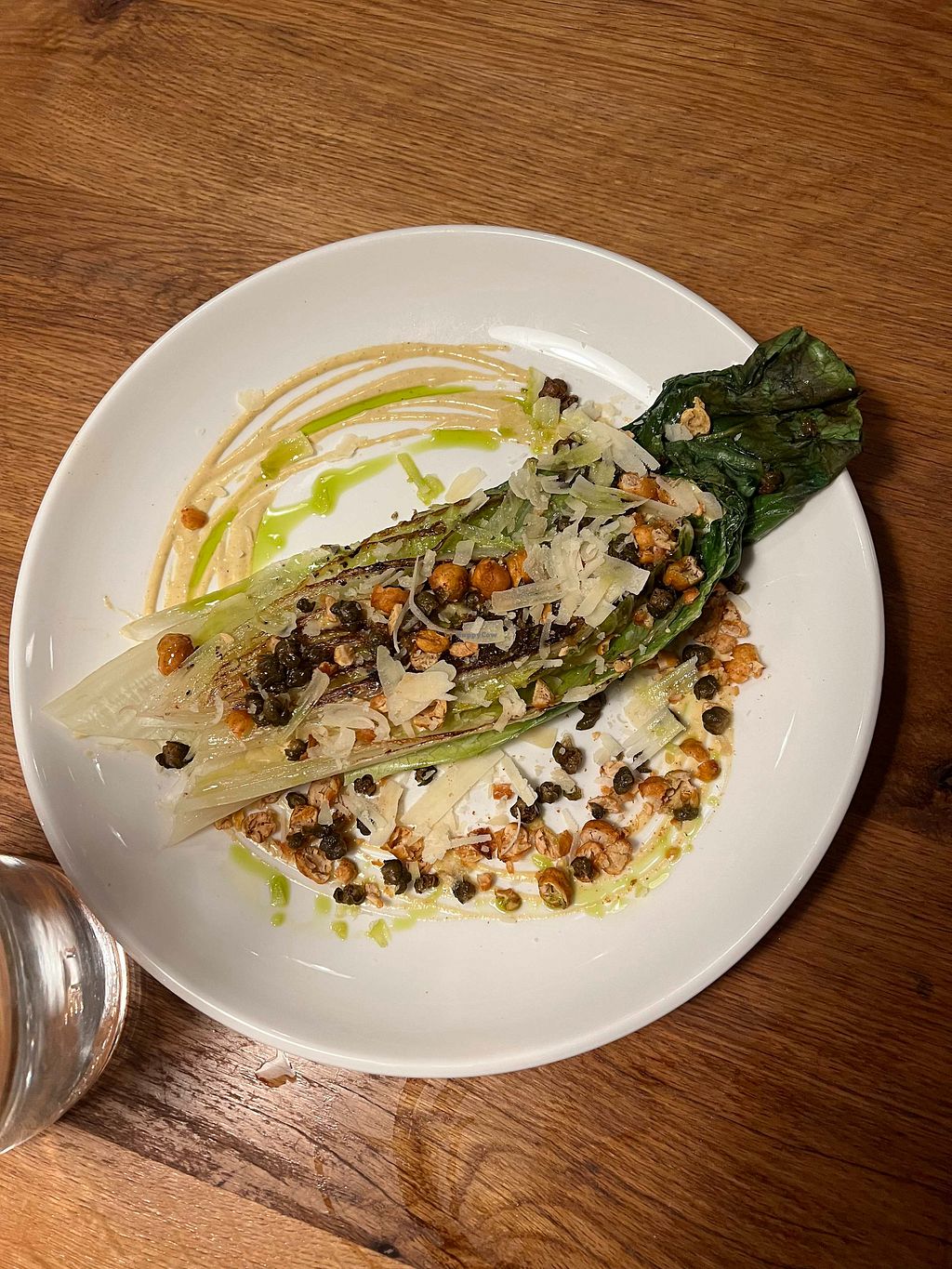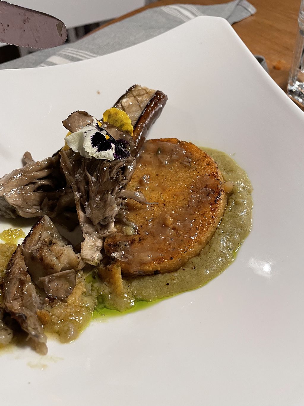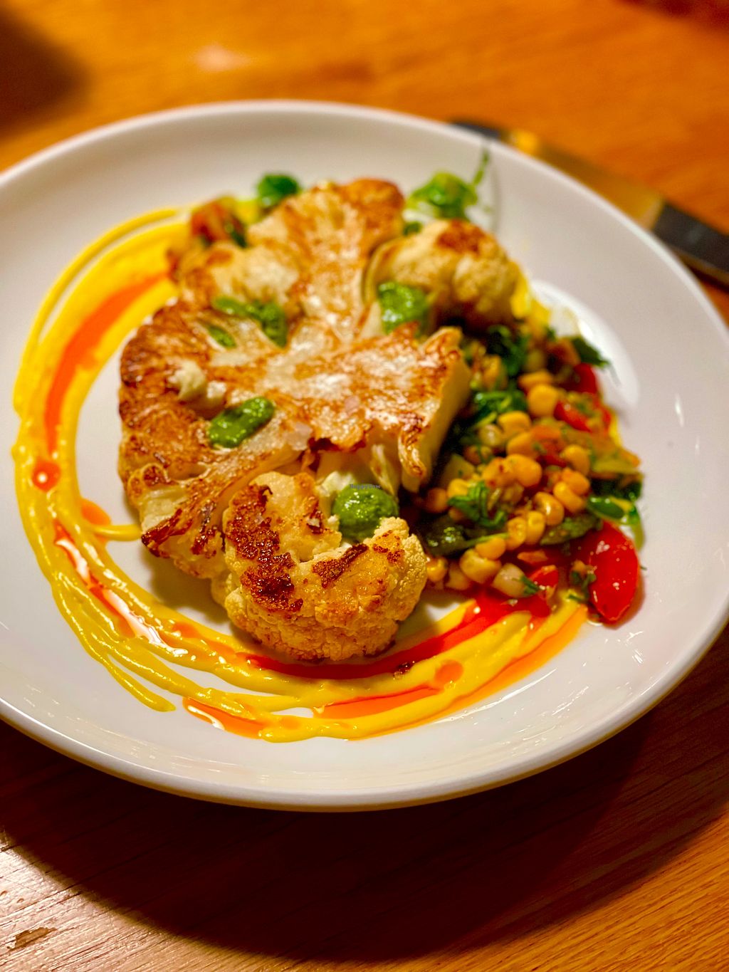 Cauliflower steak; not outstanding but garden fresh, unique flavor com…