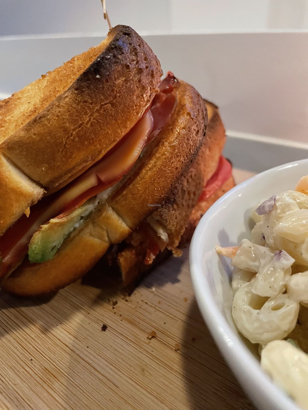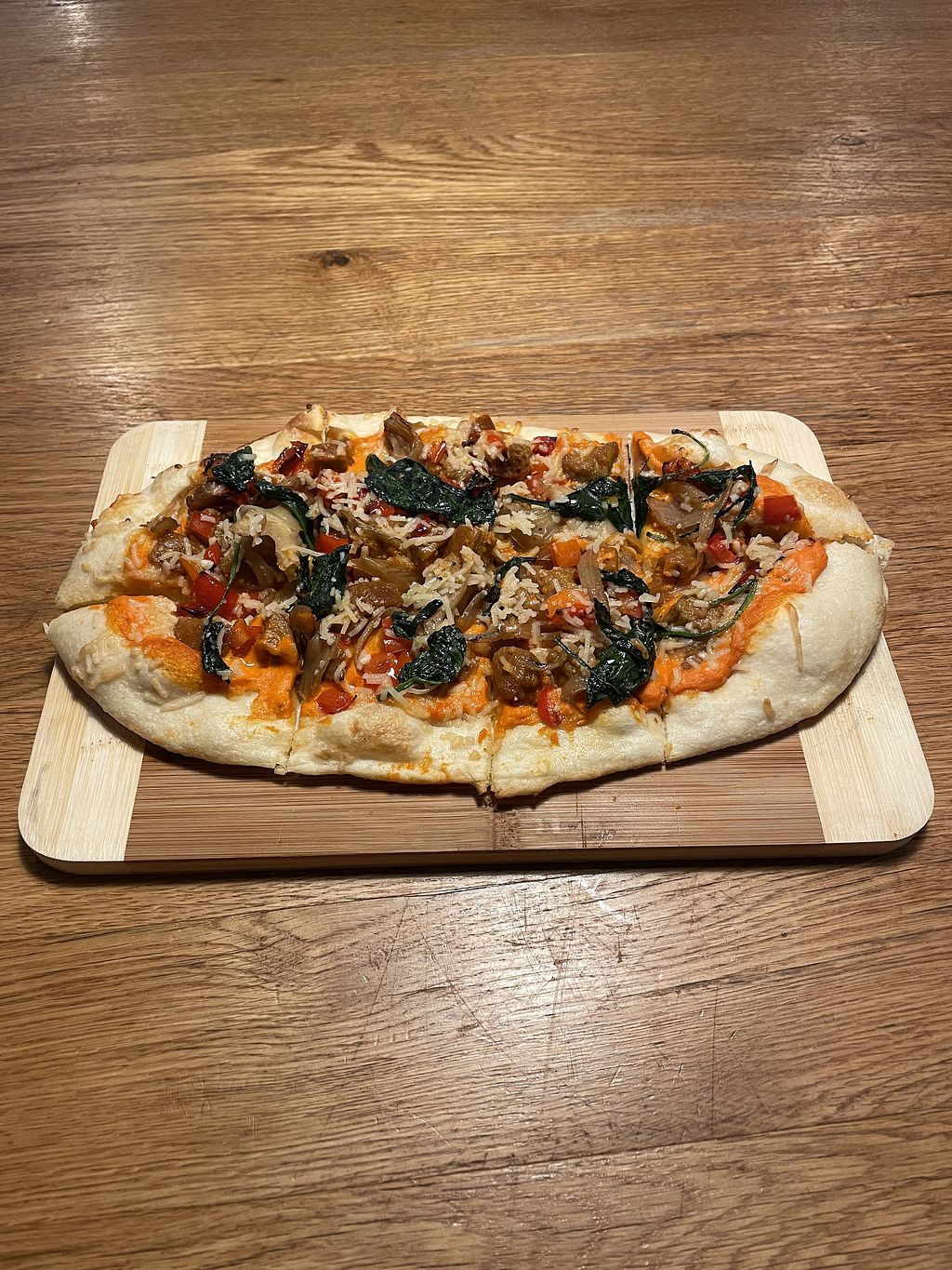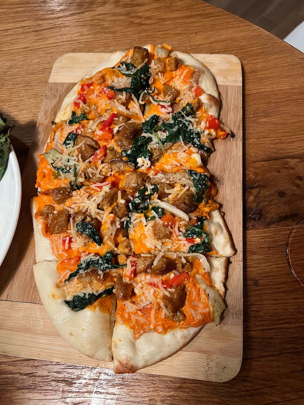 Pasta, nice herby taste with pesto and the pea shoots, I think. Burger…