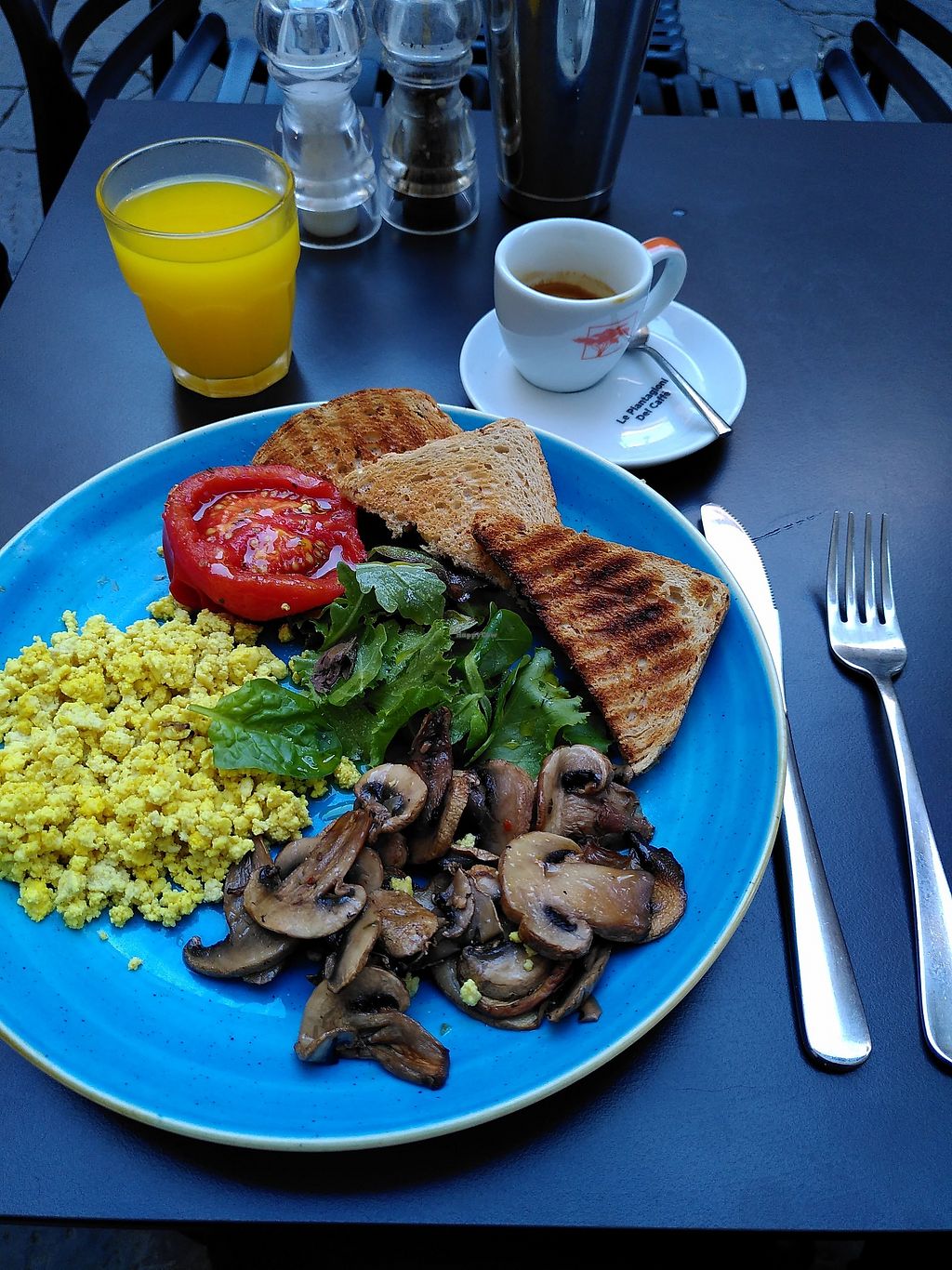 The breakfast was really nice, I got the vegana with the hummus and tomato toast, the ingredients were very fresh and had a bit of olive oil with it, the coffee is really good here, and the orange juice is delish. It was very busy though and the portion sizes weren't huge!
