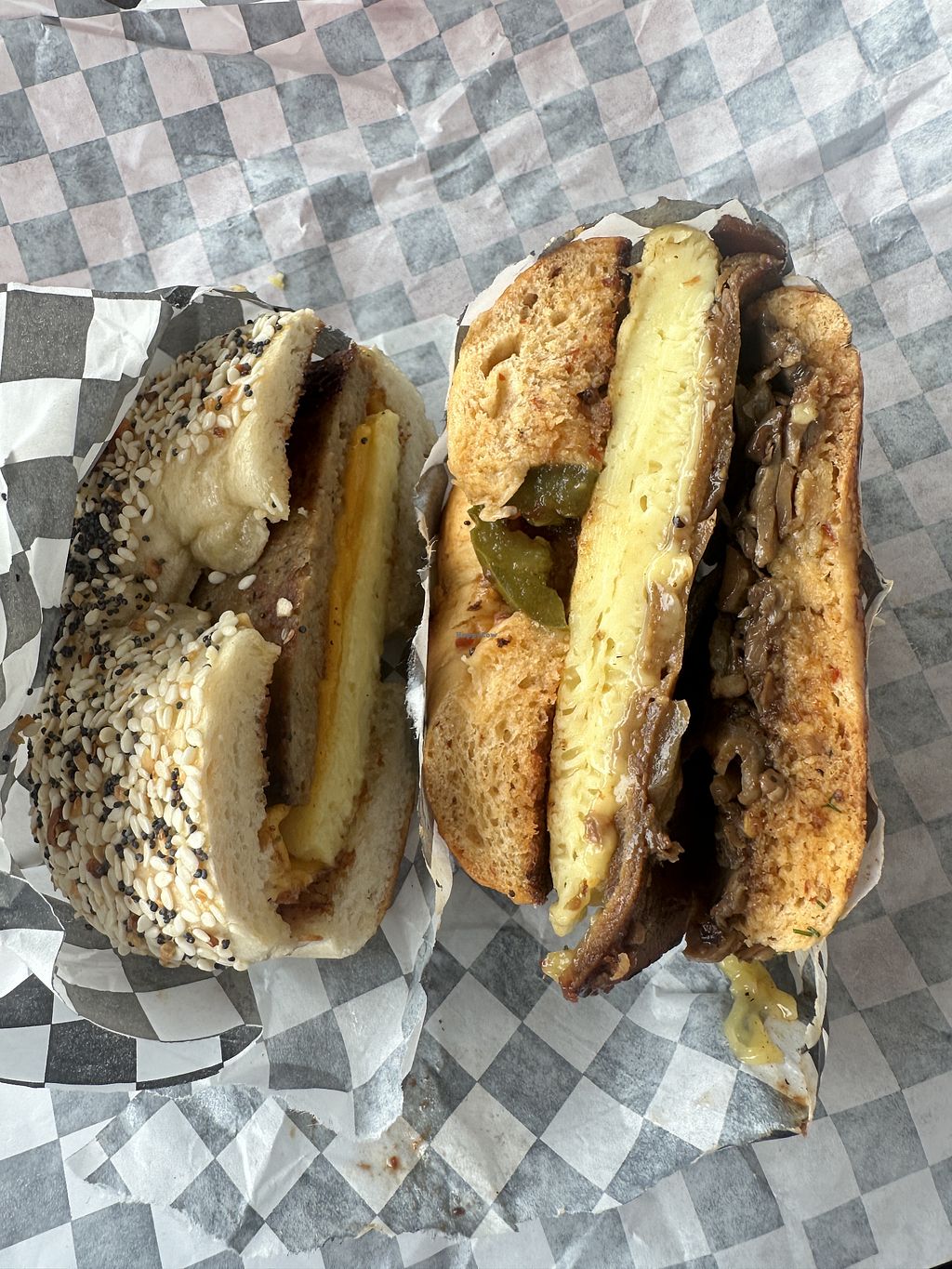 Sausage, egg, and cheese bagel and a steak and egg bagel