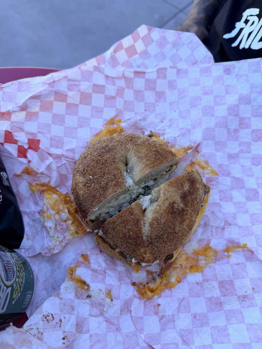 I had the Egg + Cheese + Bacon on an Onion bagel. It was really good! Definitely the best vegan bacon I've had by far, highly recommend it if you're looking for a quick meal.