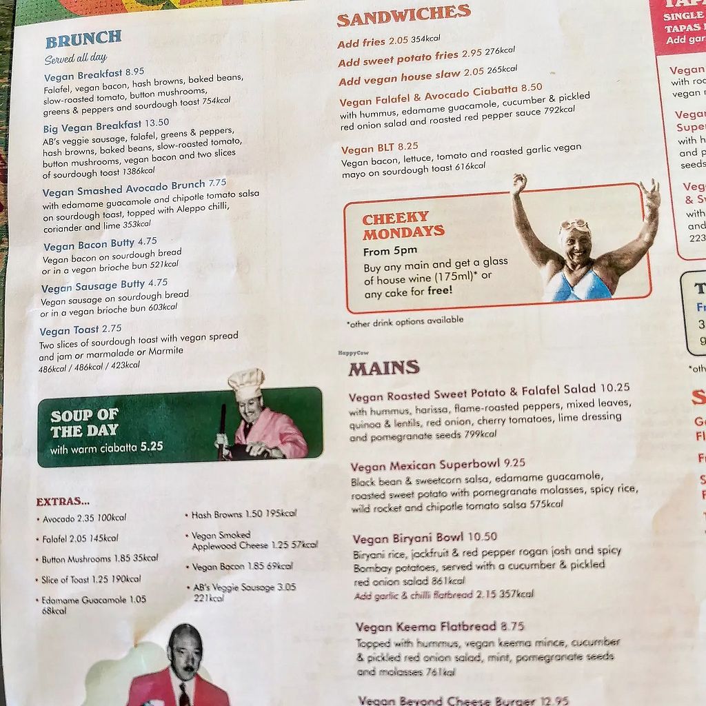 Serves meat, vegan options available. UK chain of cafe-bars offering a separate vegan menu upon request. Example vegan dishes include a vegan breakfast, jackfruit burger, falafel wrap, various salads and tapas. Also offers vegan meals for children as well as treats for dogs. Open Mon-Wed 09:00-23:00, Thu-Sat 09:00-00:00, Sun 09:00-23:00.
