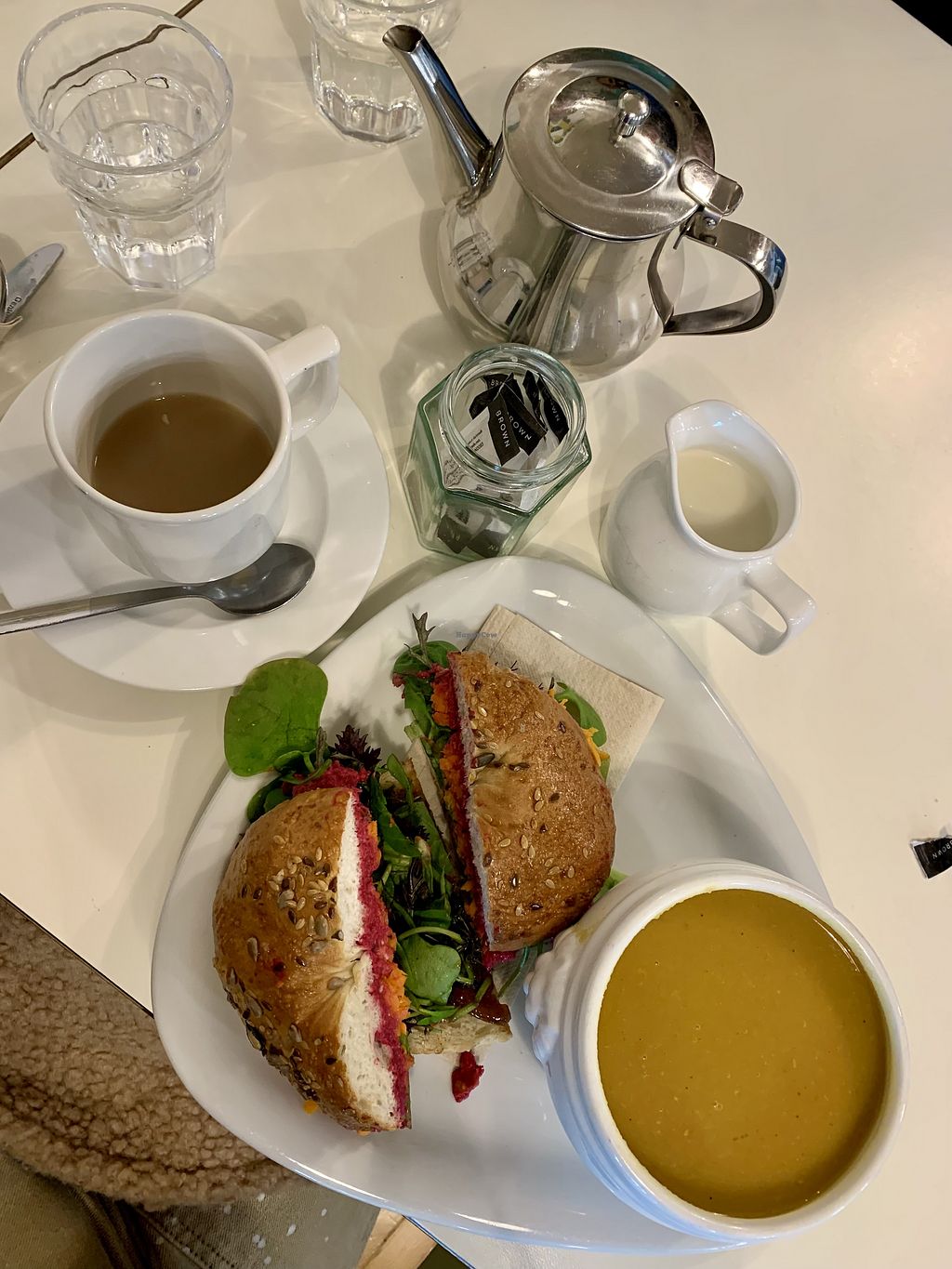 Perfect stop for a road trip. Excellent hummus bagel and veg soup.
