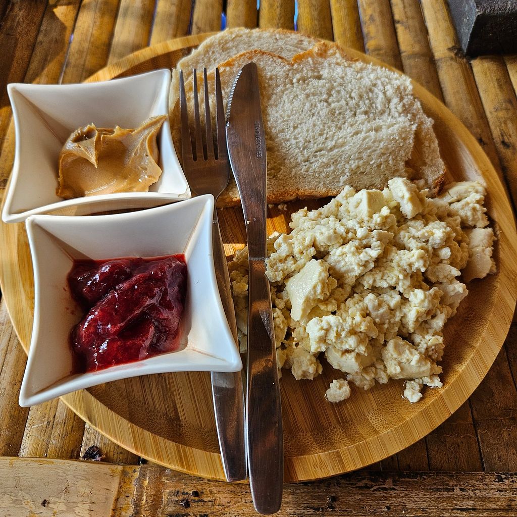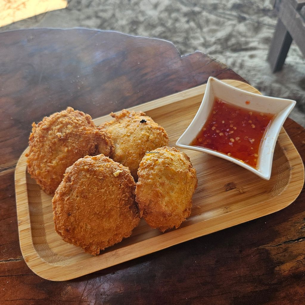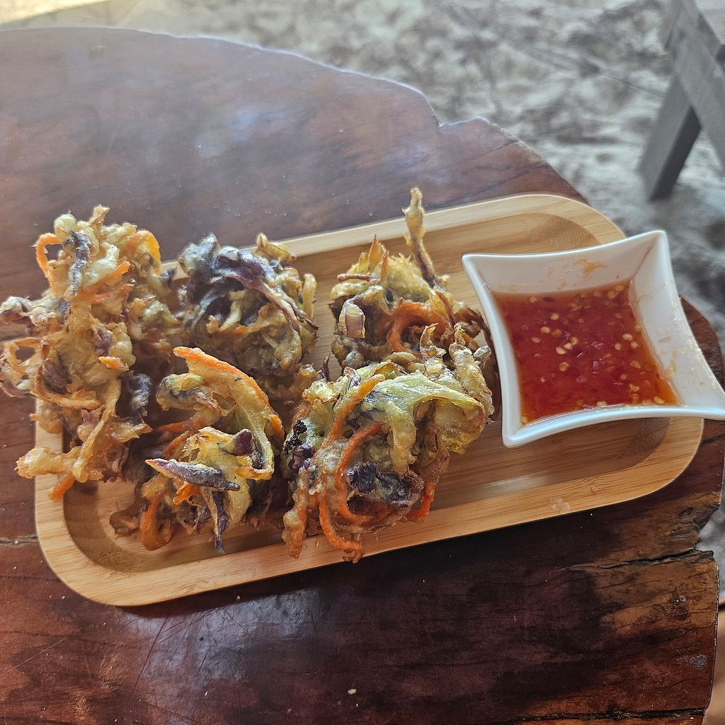 Tofu larb (made with tvp chunks) and vegetable fritters