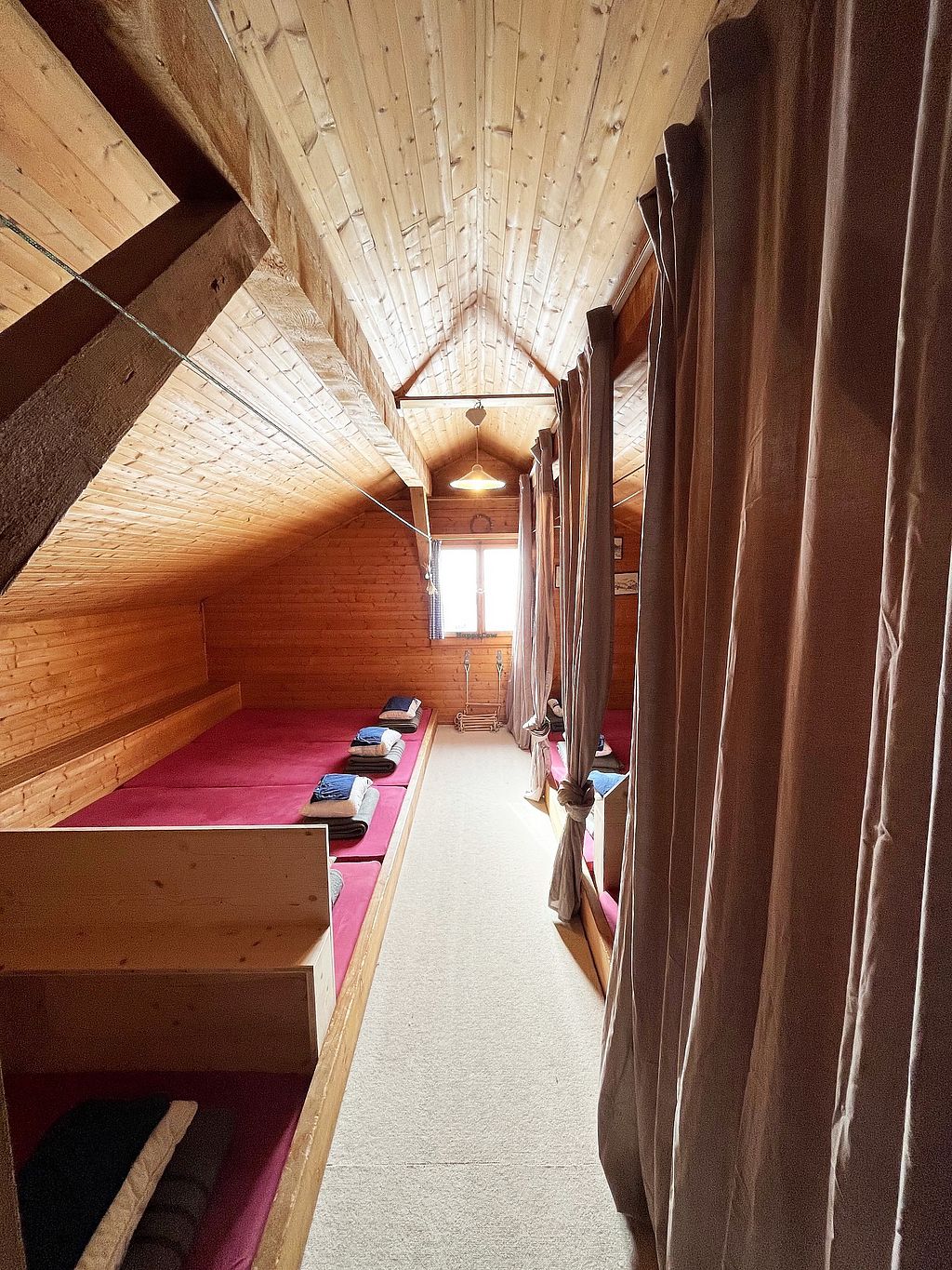 Unser gemütlicher Dachstock mit 14 Schlafplätzen, mit Vorhängen und Tr…