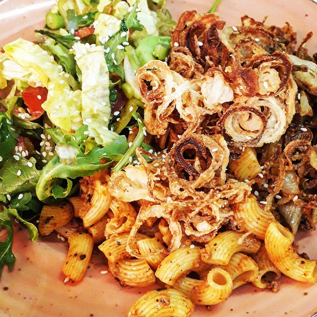 Serves meat, vegan options available. Small eatery and takeaway with food such as falafel, wraps, cookies, pizza and a dish of the day. Every Friday has an 'all-you-can-eat' option including house-made drinks. Went fully vegan summer 2019, but regressed to serving meat Dec 2019. Continues to have a seperate vegan menu. Reported closed June 2020.