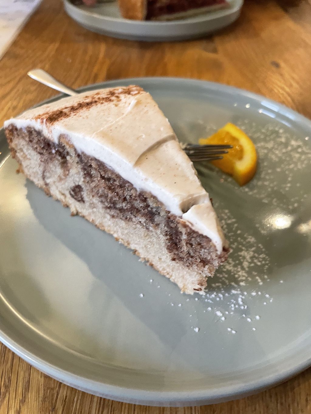 Wide variety of cakes (Friday noon around 15 different cakes) which are all vegan and - if interesting for some - all made with spelt flour.