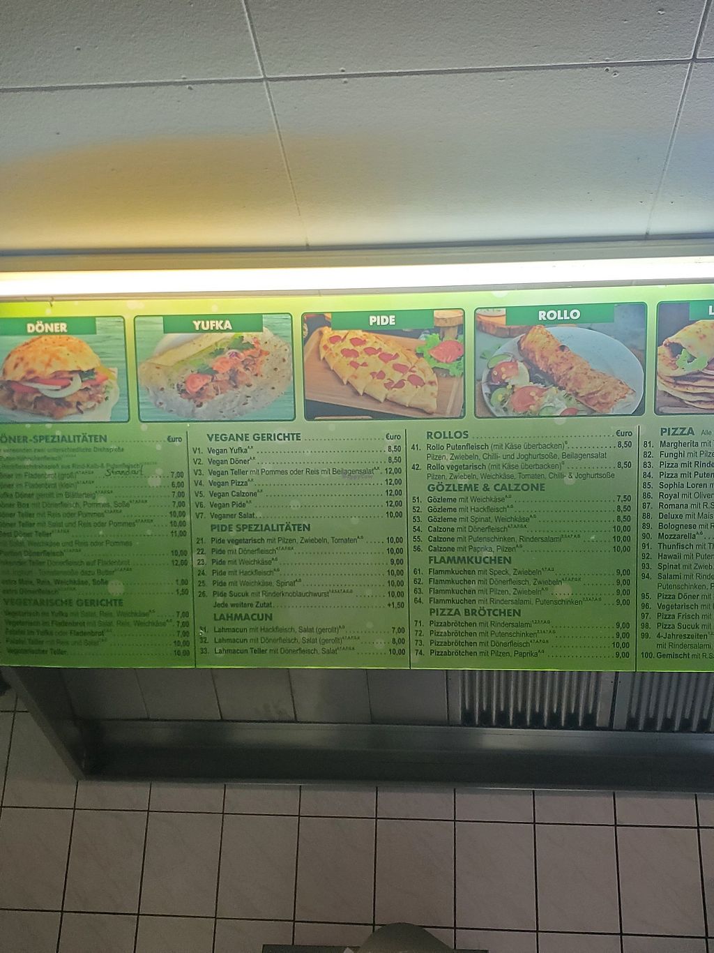 Serves meat, vegan options available. Turkish restaurant with vegan choices. Vegan menu section is clearly outlined and includes yufka (Turkish flatbread), doner, vegan plate with french fries and salad, pizza, calzone and pide. Open Mon-Sun 11:00-22:00.