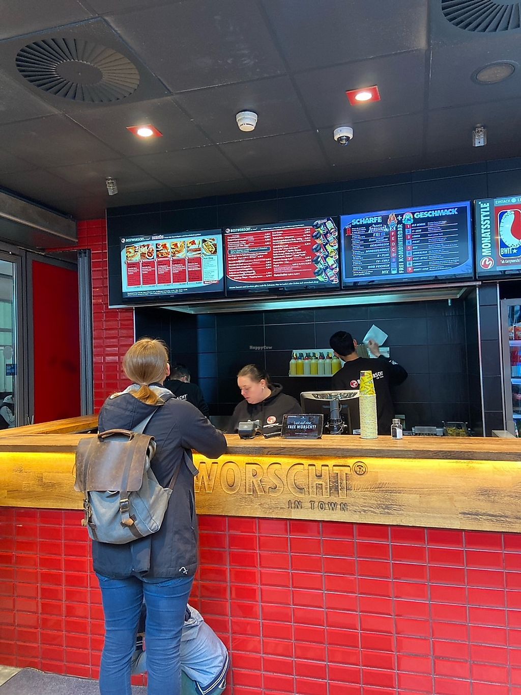Serves meat, vegan options available. Fast-food chain selling currywurst (sausage with curry-tomato sauce) with a vegan sausage option. Fries are cooked in plant oil. Choice of spice level available. Open Mon-Sat 10:00-20:00. Closed Sun.