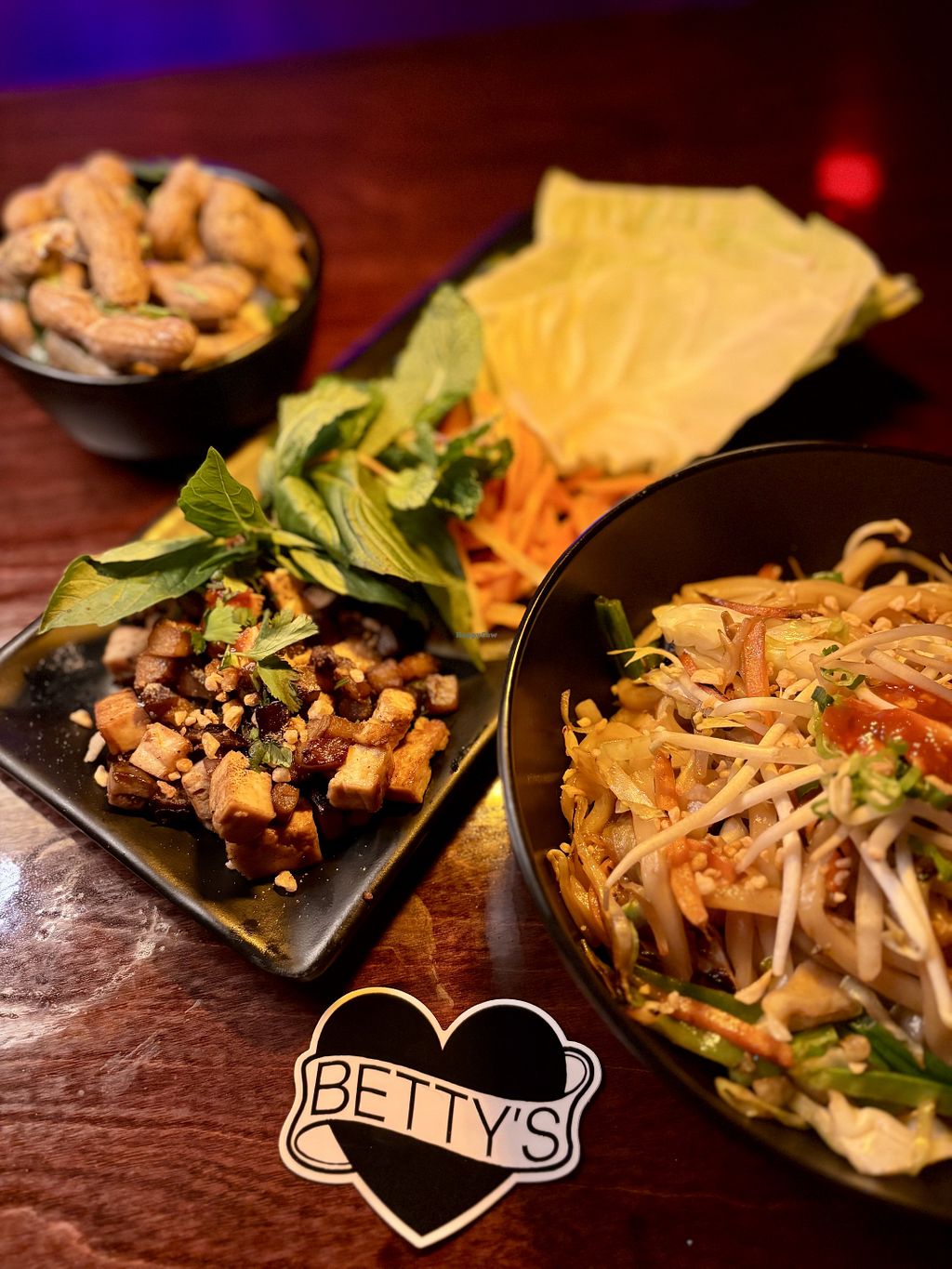 Serves meat, vegan options available. Bar, restaurant, and music venue with vegan food options, including curry boiled peanuts, pho, udon, and tofu and eggplant cabbage wraps. Open Thu-Sat 6:00pm-2:00am, Sun 2:00pm-12:00am. Closed Mon-Wed. Sunday hours may vary.