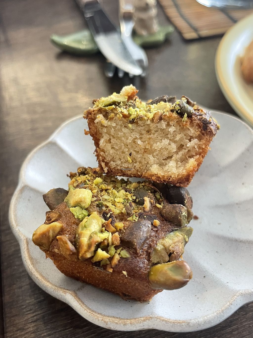 The madeleine was perfectly light and not dense with chocolate on top and rolled into a coat of pistachios !