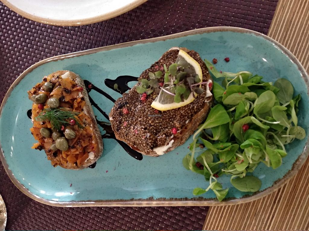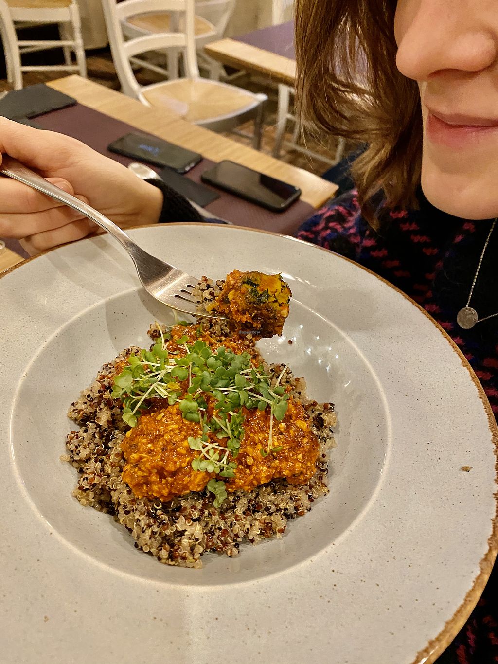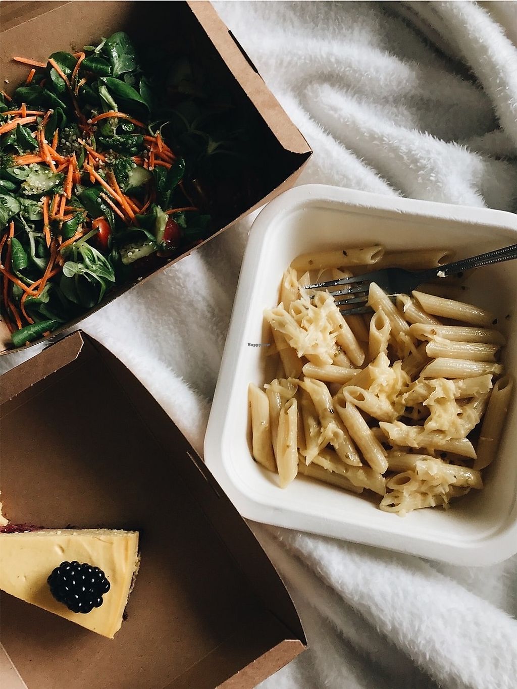 Pasta with vegan cheese, veggie salad with homemade pesto and hemp see…