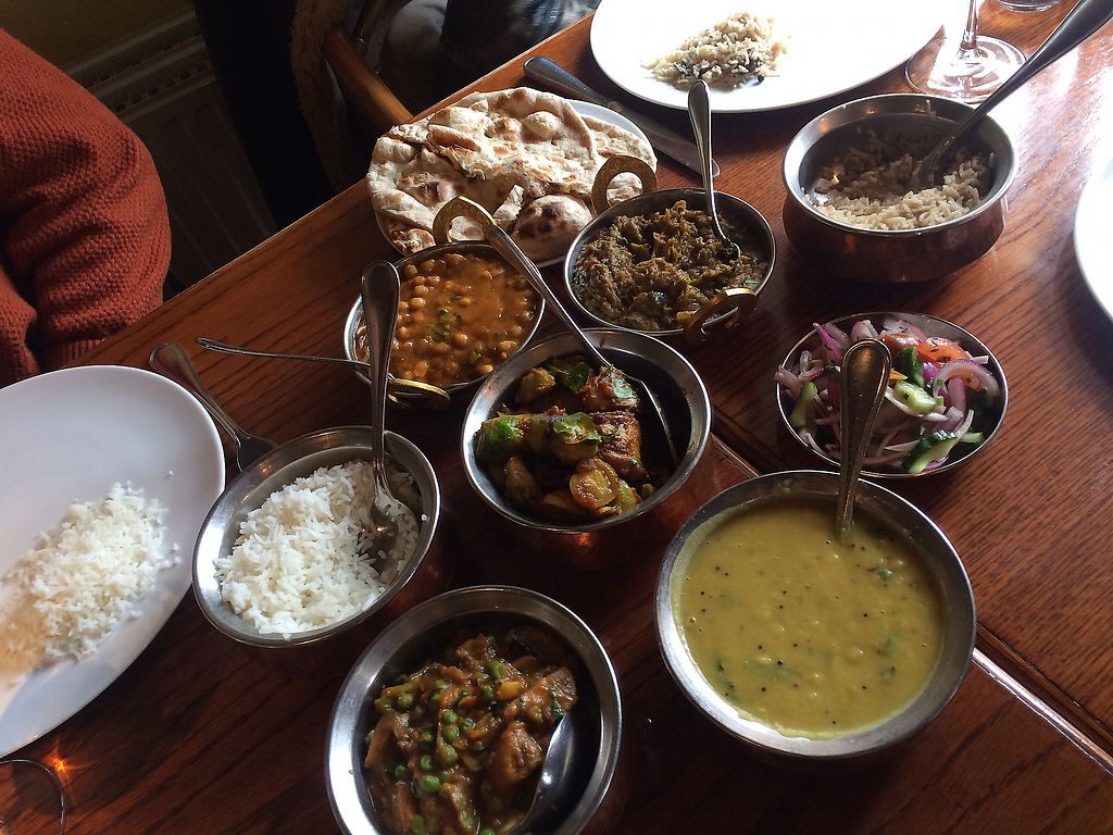 Excellent Indian restaurant with outdoor seating in picturesque square. There is a set price including starter and main. Either meat or vegetarian, some options are vegan or they would adapt. The lady serving was very careful to make sure everything supplied was vegan, for example we got a roti instead of a naan. For starter we shared a dosa and onion bhajis, followed by vegan curries with rice and roti. Very enjoyable.