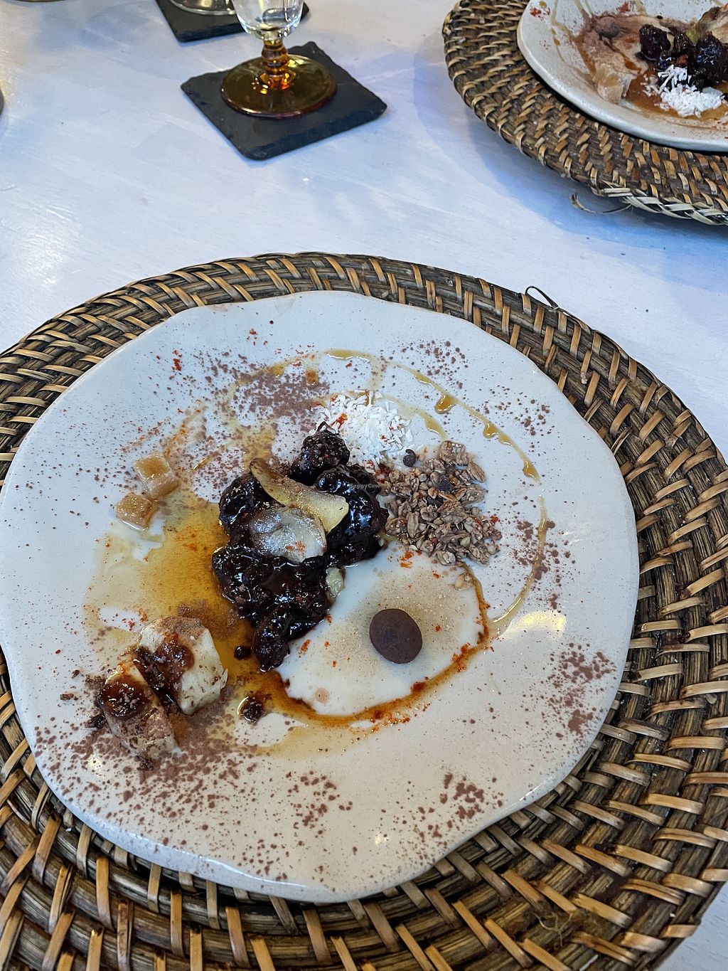 Sublime pasta with artichoke and chestnut sauce, a spinach gnocchi with hazelnut,/ tomato/ watercress pestos. Vegan desert was a plate of little dishes .. variously of chocolate dip with fresh mint, a vegan custard with toasted cereals, kiwi with smoked paprika, coconut truffle and a different chocolate truffle with a blood orange jelly.