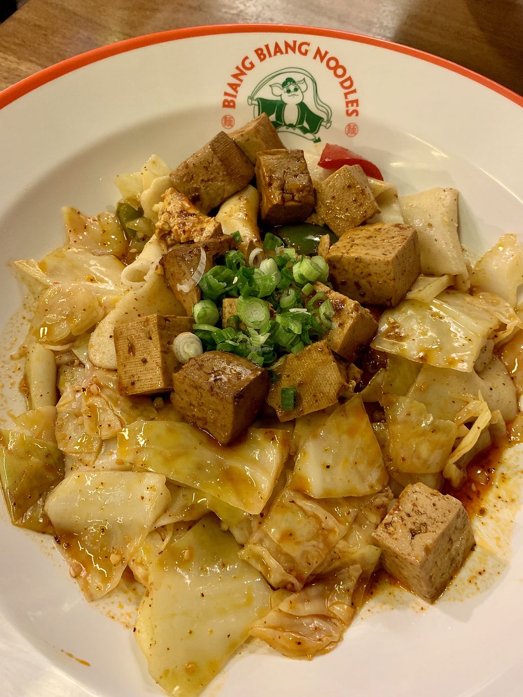 I’ve been coming to this place for years and just recently started to get the vegan mapo tofu dish. Not to mention the marginal increase in price with the accompanying decrease of protein amount, biang biang only has two vegan options and they are both dry mix noodles. There are no vegan soup noodle options unfortunately so cold, rainy, days cannot be remedied with a bowl of hot soup noodles. That being said, I highly recommend the mapo tofu dry mix with either the vegetable dumplings or scallion pancake!