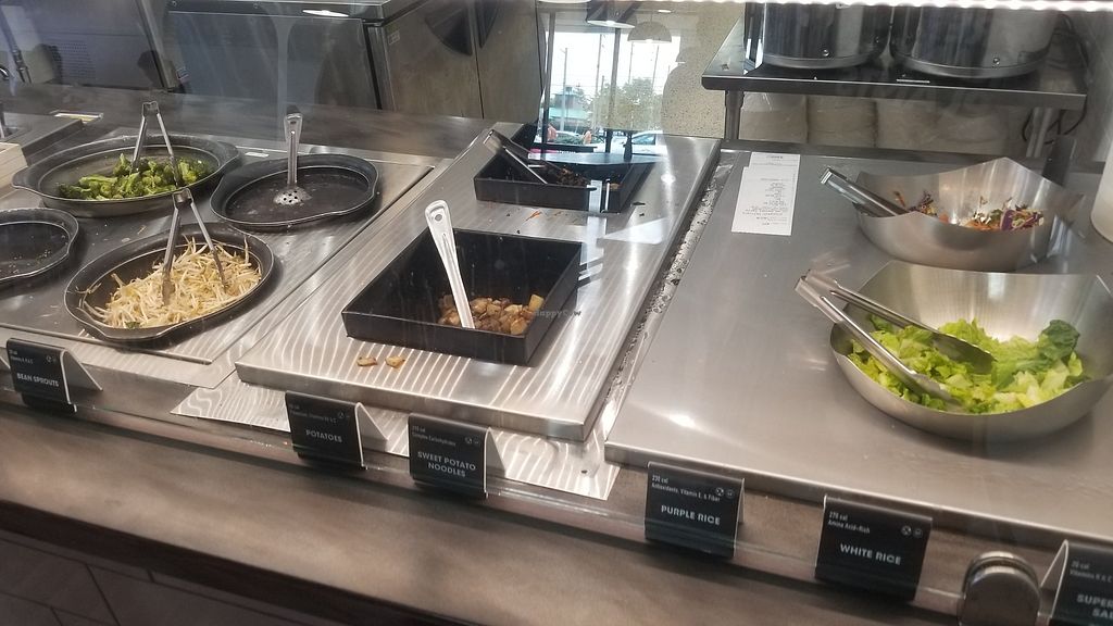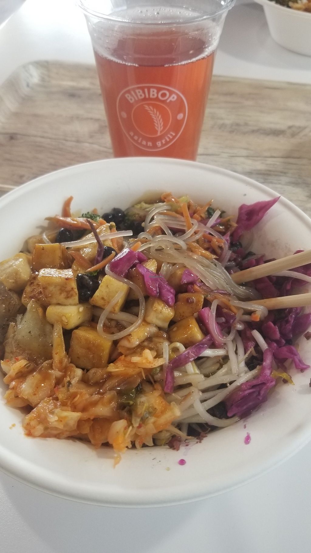 Tofu, with veggies, vegan kimchi, and purple rice underneath