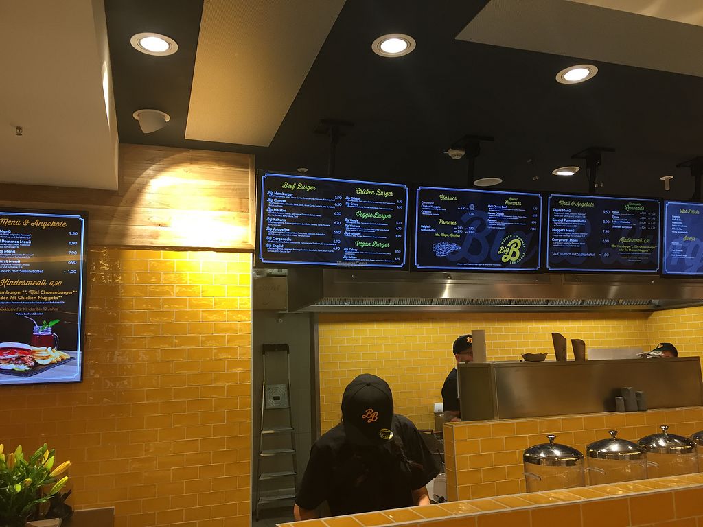 Serves meat, vegan options available. A typical burger restaurant that offers a couple of vegan burgers. Has lemonade and begian fries. Located on the main food court. Reported closed November 2023.
