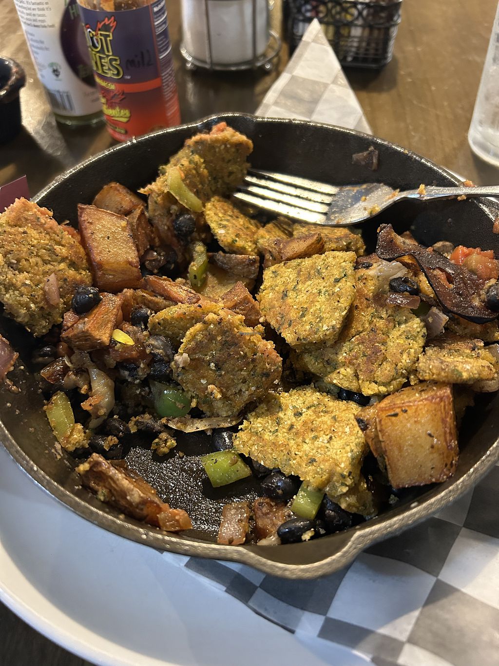 Serves meat, vegan options available. Restaurant serving breakfast and lunch. Menu includes clearly labeled vegan breakfast skillet. Also offers salad, fruit and toast. Specify vegan when ordering. Open Mon-Sun 8:00am-3:00pm.