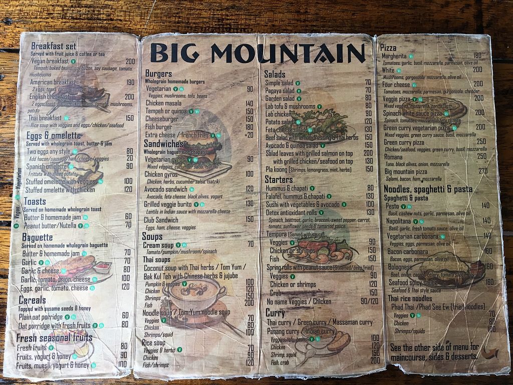 Menu Big Mountain Restaurant in Koh Phangan Srithanu Area