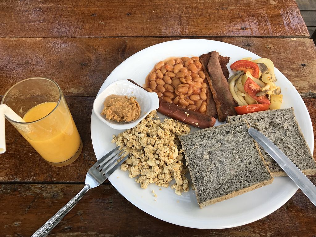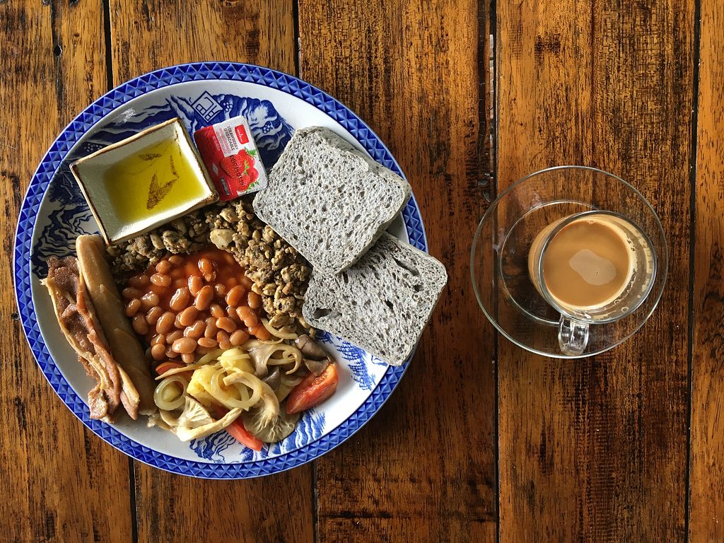 The Vegan Breakfast with bread, jam, baked beans, scrambled tempeh, ve…